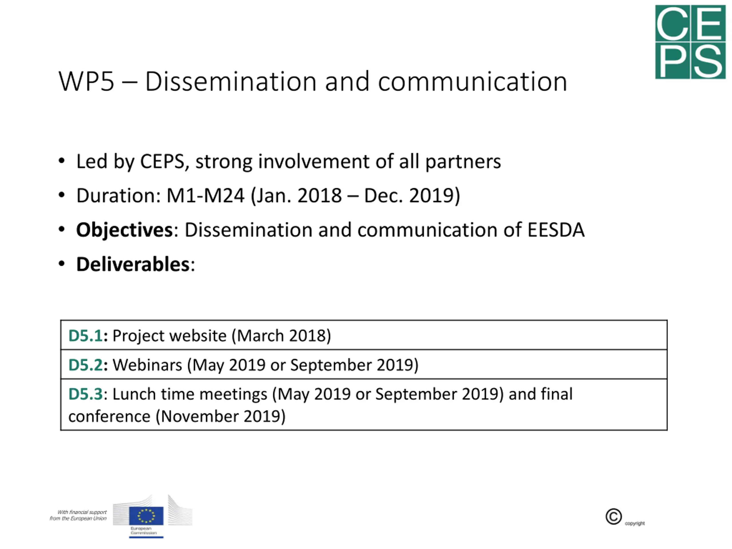 WP5 Dissemination and communication Led by CEPS, strong involvement of all partners Duration: M1-M24 (Jan. 2018 Dec. 2019) Objectives: Dissemination and communication of EESDA Deliverables: D5.1: Project website (March 2018) D5.2: Webinars (May 2019 or September 2019) D5.3: Lunch time meetings (May 2019 or September 2019) and final conference (November 2019) With financial support from the European Union