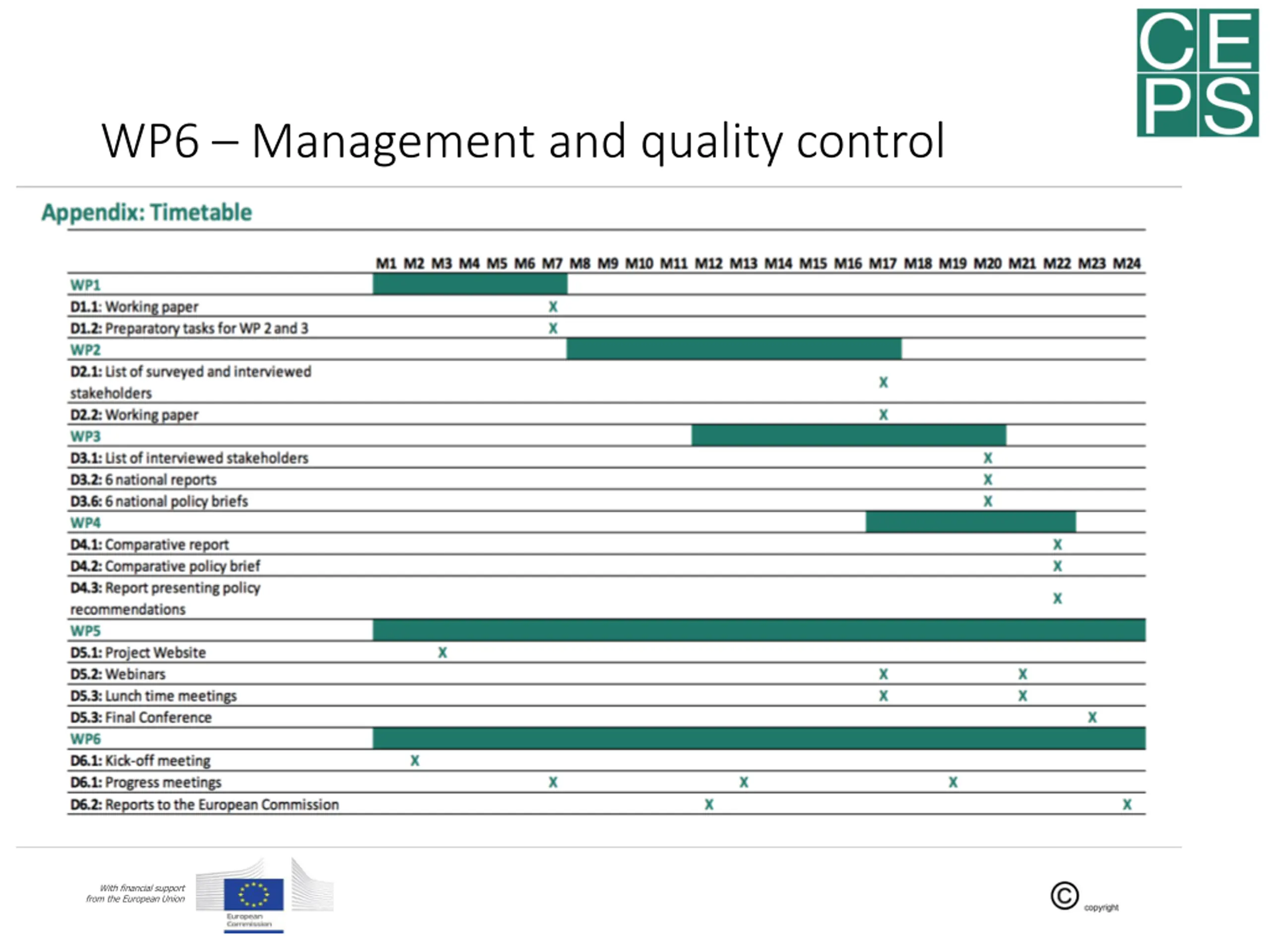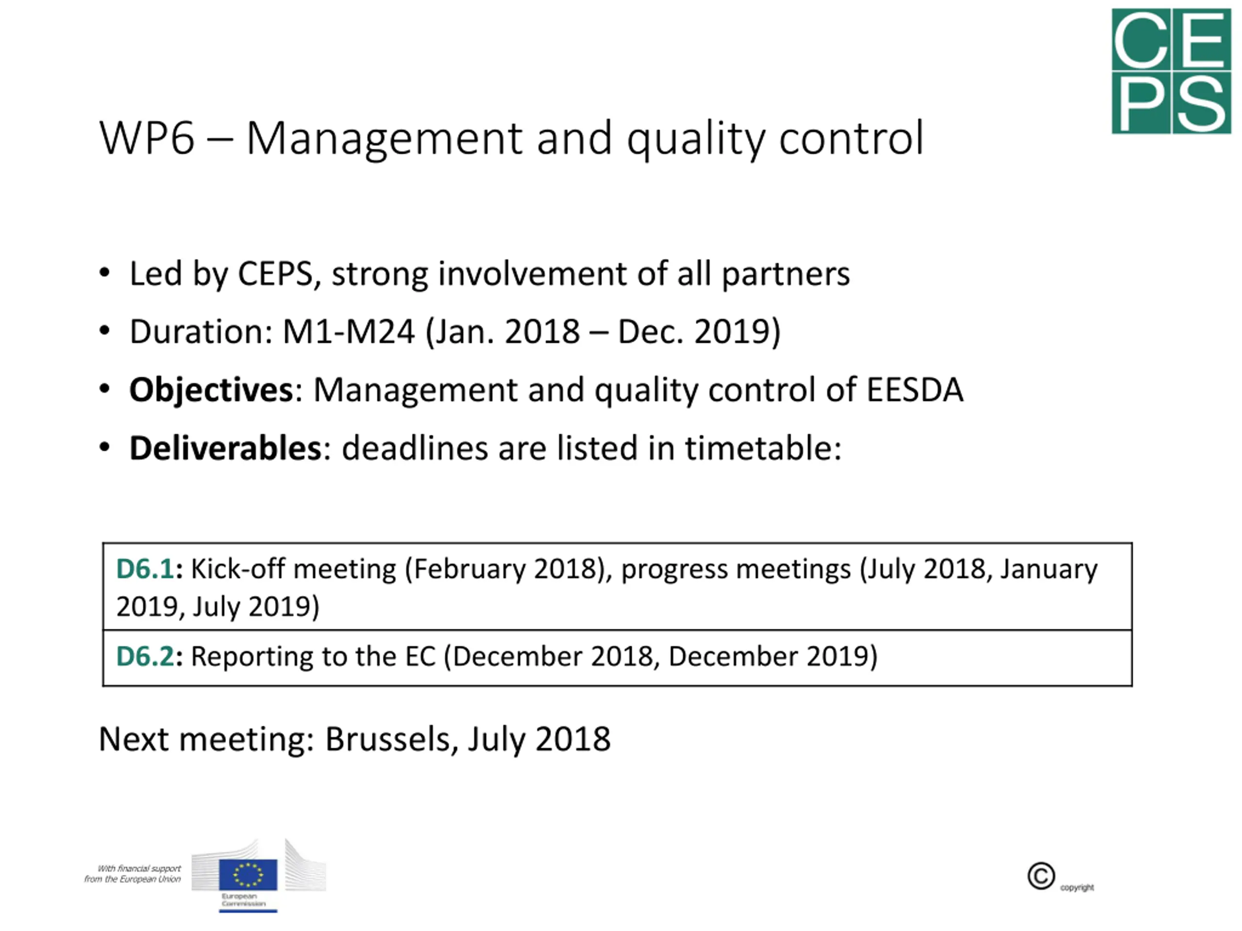 WP6 Management and quality control Led by CEPS, strong involvement of all partners Duration: M1-M24 (Jan. 2018 Dec. 2019) Objectives: Management and quality control of EESDA Deliverables: deadlines are listed in timetable: D6.1: Kick-off meeting (February 2018), progress meetings (July 2018, January 2019, July 2019) D6.2: Reporting to the EC (December 2018, December 2019) Next meeting: Brussels, July 2018 With financial support from the European Union
