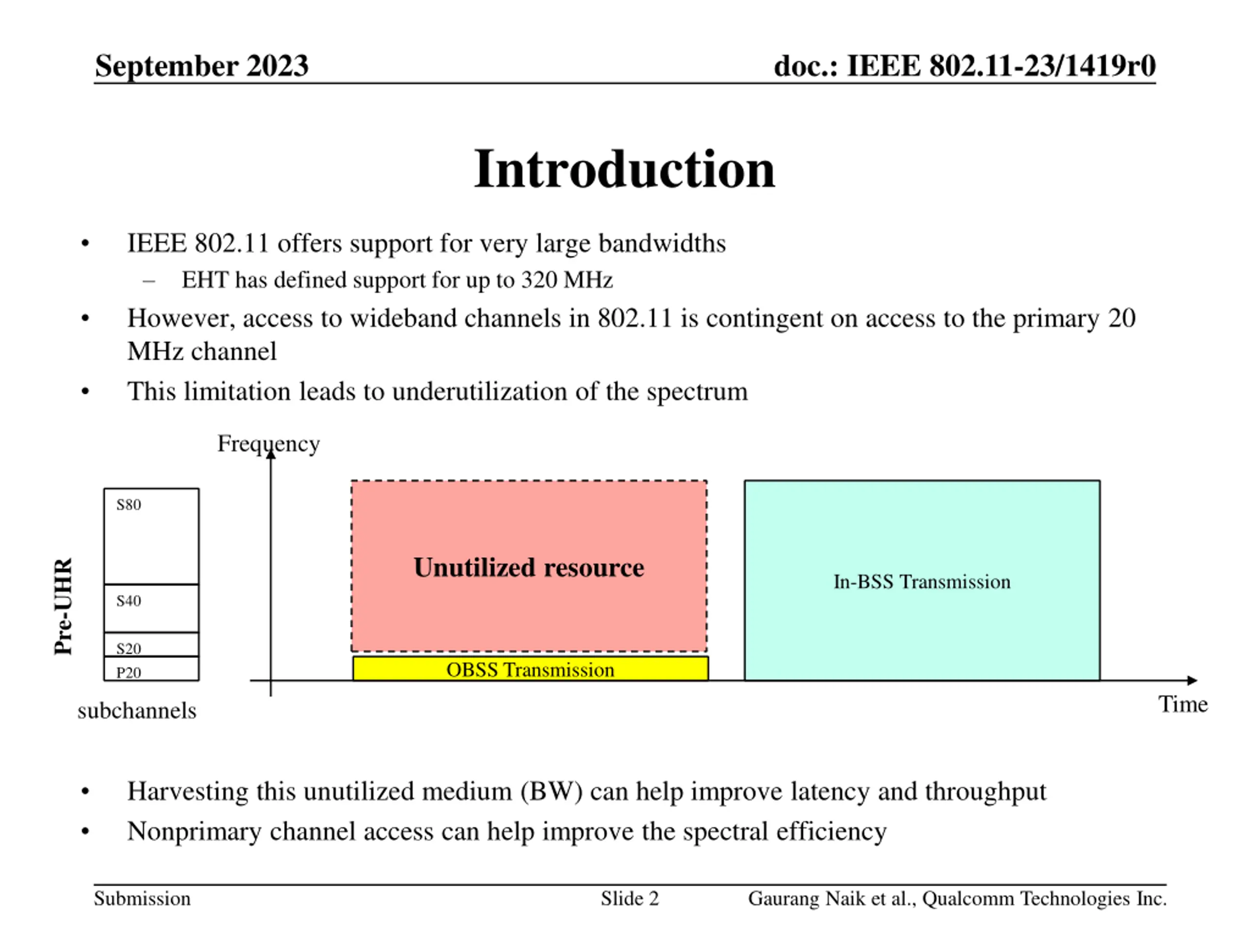 September 2023 doc.: IEEE 802.11-23/1419r0 Introduction IEEE 802.11 offers support for very large bandwidths EHT has defined support for up to 320 MHz However, access to wideband channels in 802.11 is contingent on access to the primary 20 MHz channel This limitation leads to underutilization of the spectrum Frequency S80 Unutilized resource Pre-UHR In-BSS Transmission S40 S20 OBSS Transmission P20 Time subchannels Harvesting this unutilized medium (BW) can help improve latency and throughput Nonprimary channel access can help improve the spectral efficiency Submission Slide 2 Gaurang Naik et al., Qualcomm Technologies Inc.