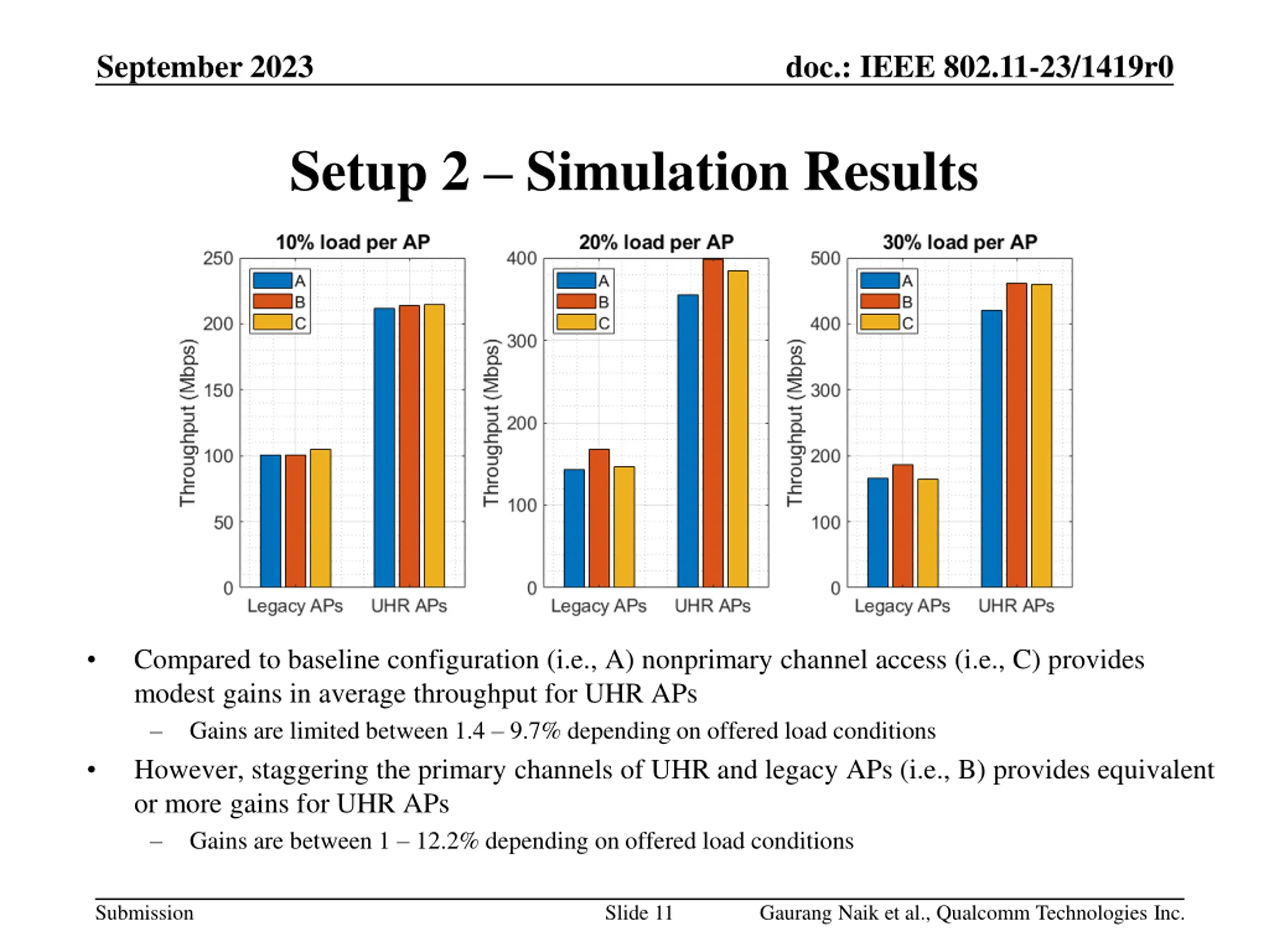 September 2023 doc.: IEEE 802.11-23/1419r0 Setup 2 Simulation Results Compared to baseline configuration (i.e., A) nonprimary channel access (i.e., C) provides modest gains in average throughput for UHR APs Gains are limited between 1.4 9.7% depending on offered load conditions However, staggering the primary channels of UHR and legacy APs (i.e., B) provides equivalent or more gains for UHR APs Gains are between 1 12.2% depending on offered load conditions Submission Slide 11 Gaurang Naik et al., Qualcomm Technologies Inc.