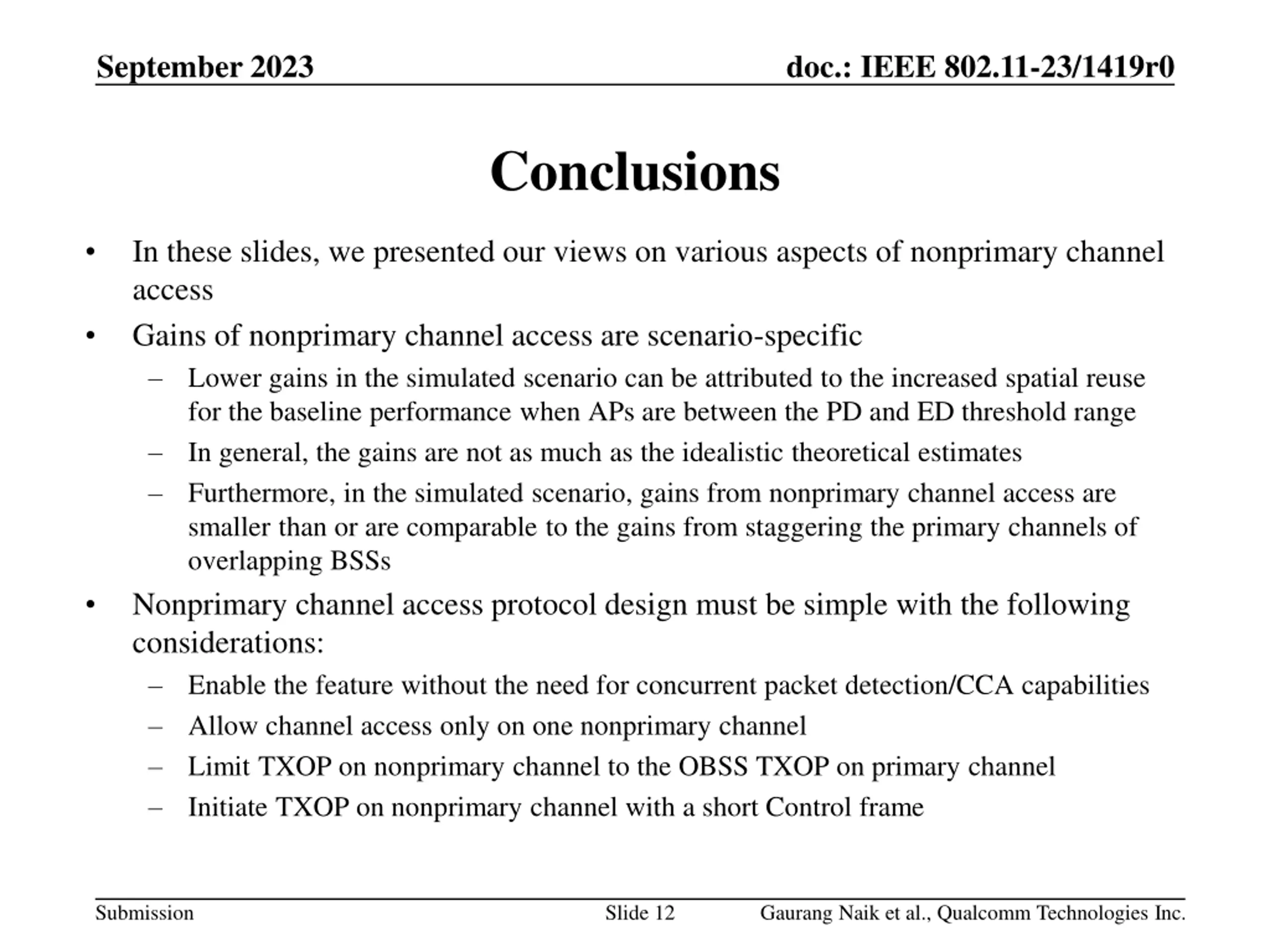 September 2023 doc.: IEEE 802.11-23/1419r0 Conclusions In these slides, we presented our views on various aspects of nonprimary channel access Gains of nonprimary channel access are scenario-specific Lower gains in the simulated scenario can be attributed to the increased spatial reuse for the baseline performance when APs are between the PD and ED threshold range In general, the gains are not as much as the idealistic theoretical estimates Furthermore, in the simulated scenario, gains from nonprimary channel access are smaller than or are comparable to the gains from staggering the primary channels of overlapping BSSs Nonprimary channel access protocol design must be simple with the following considerations: Enable the feature without the need for concurrent packet detection/CCA capabilities Allow channel access only on one nonprimary channel Limit TXOP on nonprimary channel to the OBSS TXOP on primary channel Initiate TXOP on nonprimary channel with a short Control frame Submission Slide 12 Gaurang Naik et al., Qualcomm Technologies Inc.