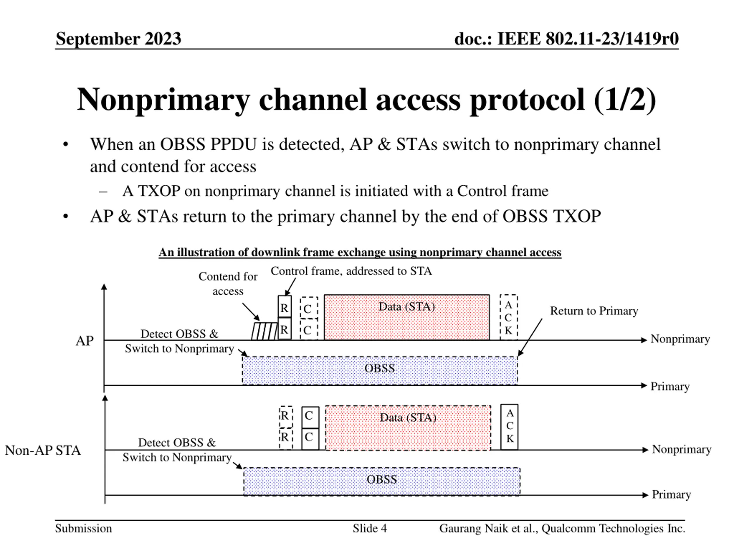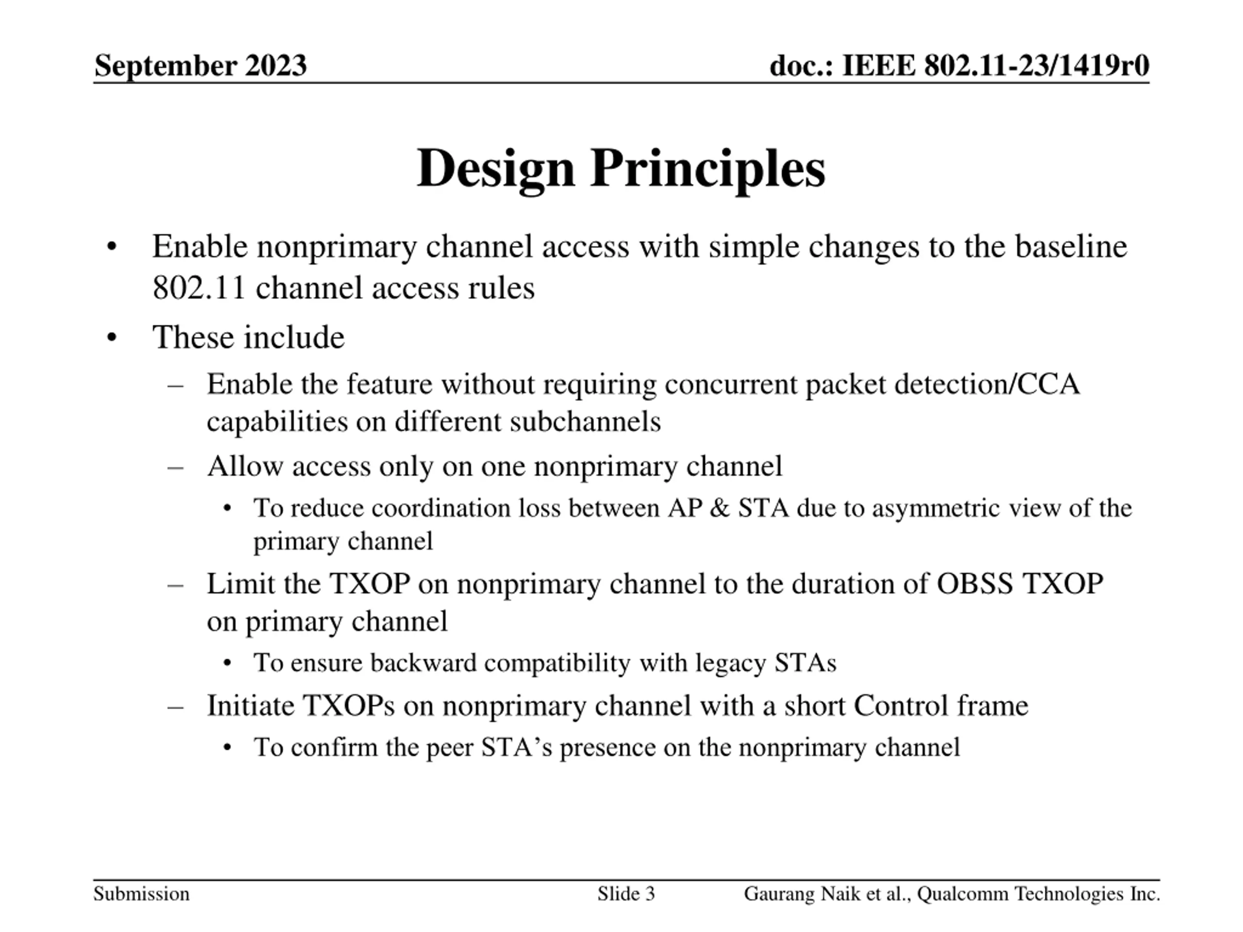 September 2023 doc.: IEEE 802.11-23/1419r0 Design Principles Enable nonprimary channel access with simple changes to the baseline 802.11 channel access rules These include Enable the feature without requiring concurrent packet detection/CCA capabilities on different subchannels Allow access only on one nonprimary channel To reduce coordination loss between AP & STA due to asymmetric view of the primary channel Limit the TXOP on nonprimary channel to the duration of OBSS TXOP on primary channel To ensure backward compatibility with legacy STAs Initiate TXOPs on nonprimary channel with a short Control frame To confirm the peer STA s presence on the nonprimary channel Submission Slide 3 Gaurang Naik et al., Qualcomm Technologies Inc.