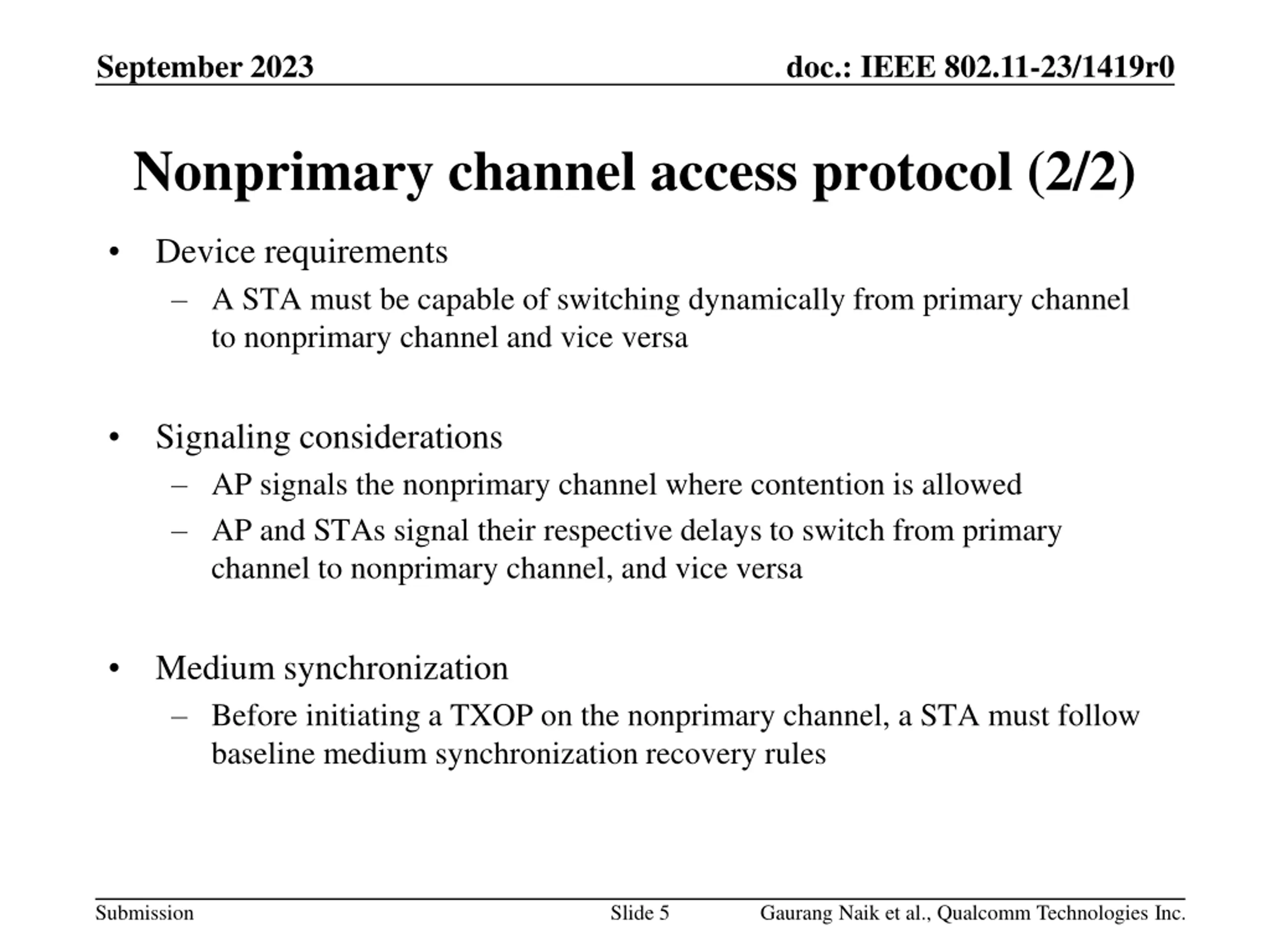 September 2023 doc.: IEEE 802.11-23/1419r0 Nonprimary channel access protocol (2/2) Device requirements A STA must be capable of switching dynamically from primary channel to nonprimary channel and vice versa Signaling considerations AP signals the nonprimary channel where contention is allowed AP and STAs signal their respective delays to switch from primary channel to nonprimary channel, and vice versa Medium synchronization Before initiating a TXOP on the nonprimary channel, a STA must follow baseline medium synchronization recovery rules Submission Slide 5 Gaurang Naik et al., Qualcomm Technologies Inc.