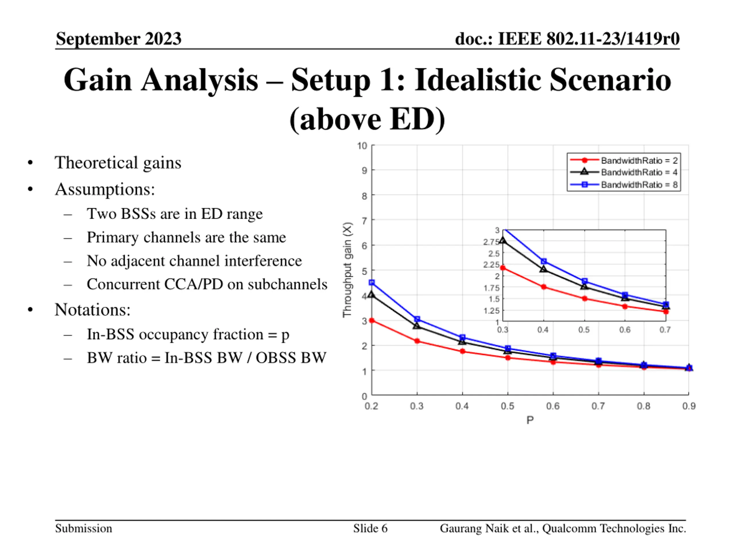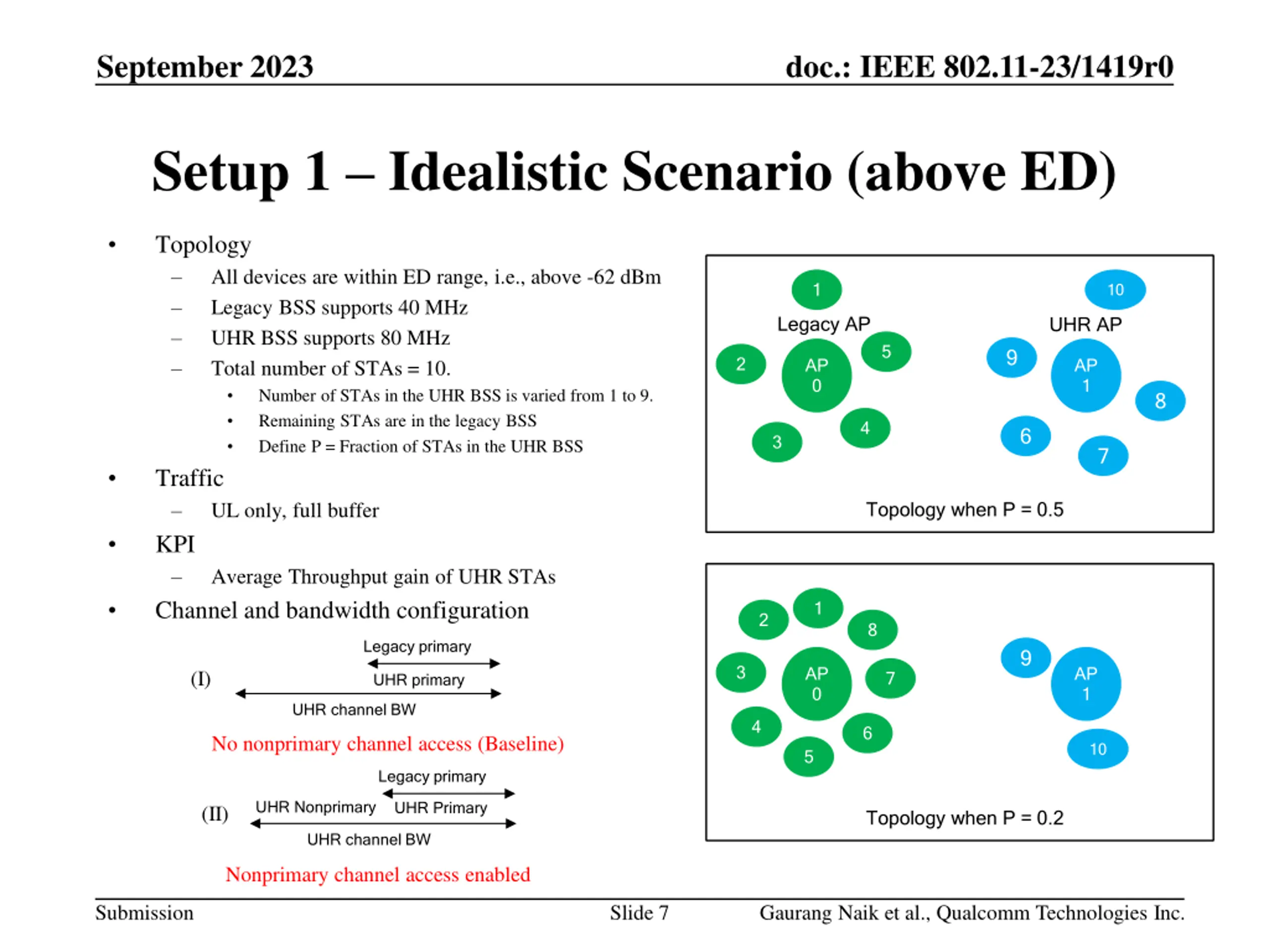 September 2023 doc.: IEEE 802.11-23/1419r0 Gain Analysis Setup 1: Idealistic Scenario (above ED) Theoretical gains Assumptions: Two BSSs are in ED range Primary channels are the same No adjacent channel interference Concurrent CCA/PD on subchannels Notations: In-BSS occupancy fraction = p BW ratio = In-BSS BW / OBSS BW Submission Slide 6 Gaurang Naik et al., Qualcomm Technologies Inc.