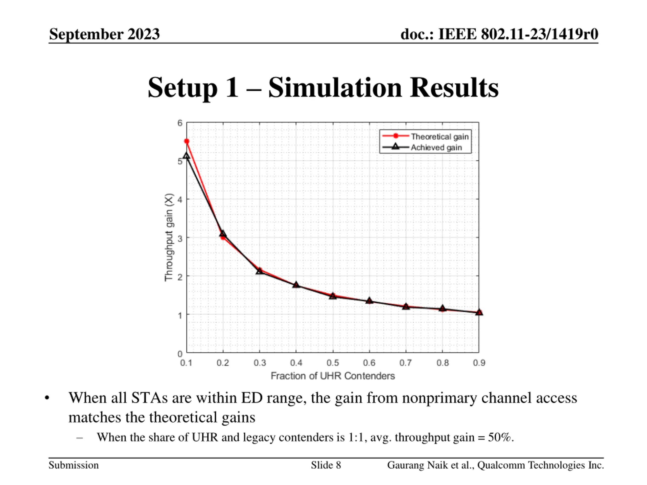 September 2023 doc.: IEEE 802.11-23/1419r0 Setup 1 Simulation Results When all STAs are within ED range, the gain from nonprimary channel access matches the theoretical gains When the share of UHR and legacy contenders is 1:1, avg. throughput gain = 50%. Submission Slide 8 Gaurang Naik et al., Qualcomm Technologies Inc.