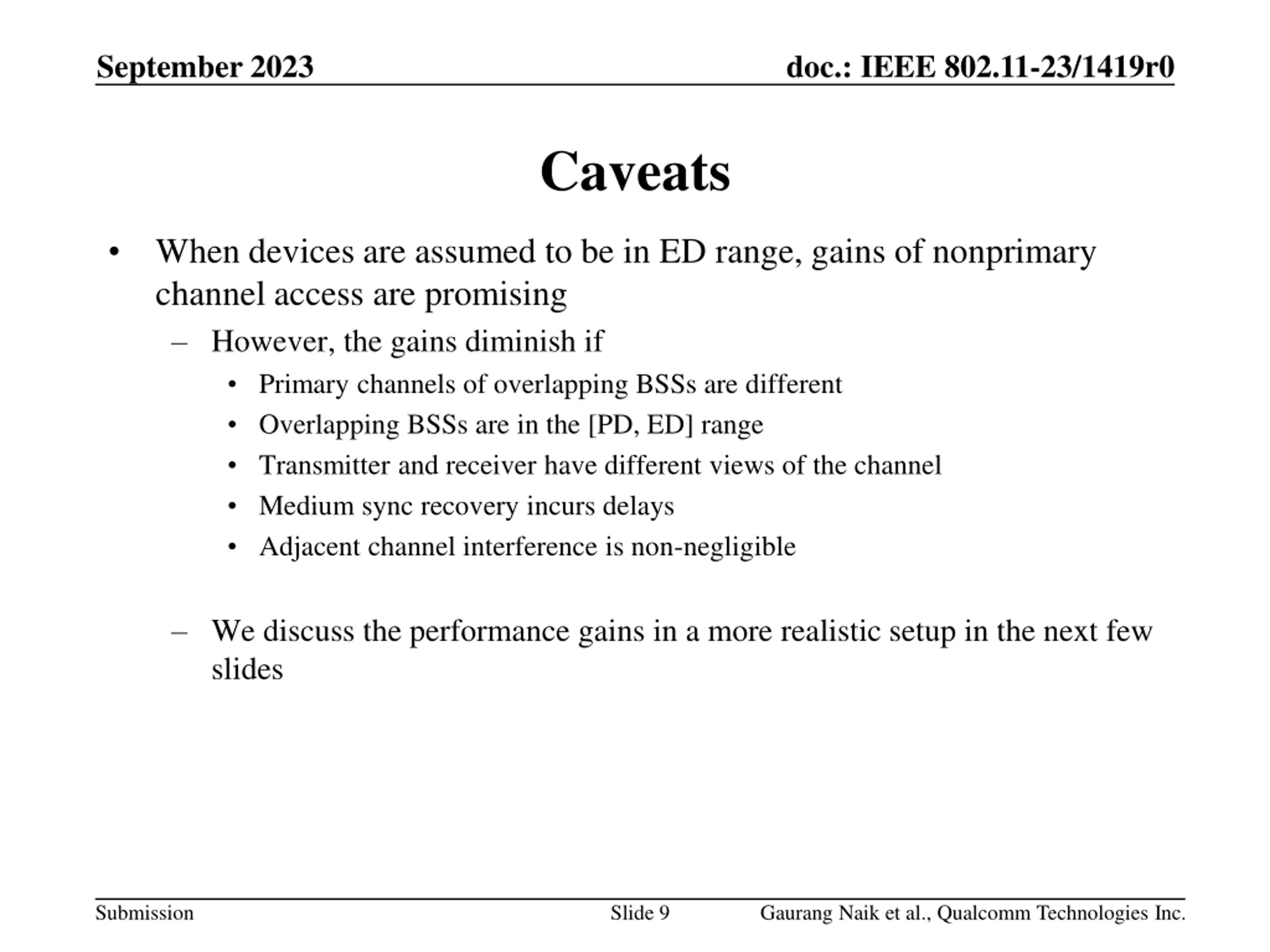 September 2023 doc.: IEEE 802.11-23/1419r0 Caveats When devices are assumed to be in ED range, gains of nonprimary channel access are promising However, the gains diminish if Primary channels of overlapping BSSs are different Overlapping BSSs are in the [PD, ED] range Transmitter and receiver have different views of the channel Medium sync recovery incurs delays Adjacent channel interference is non-negligible We discuss the performance gains in a more realistic setup in the next few slides Submission Slide 9 Gaurang Naik et al., Qualcomm Technologies Inc.