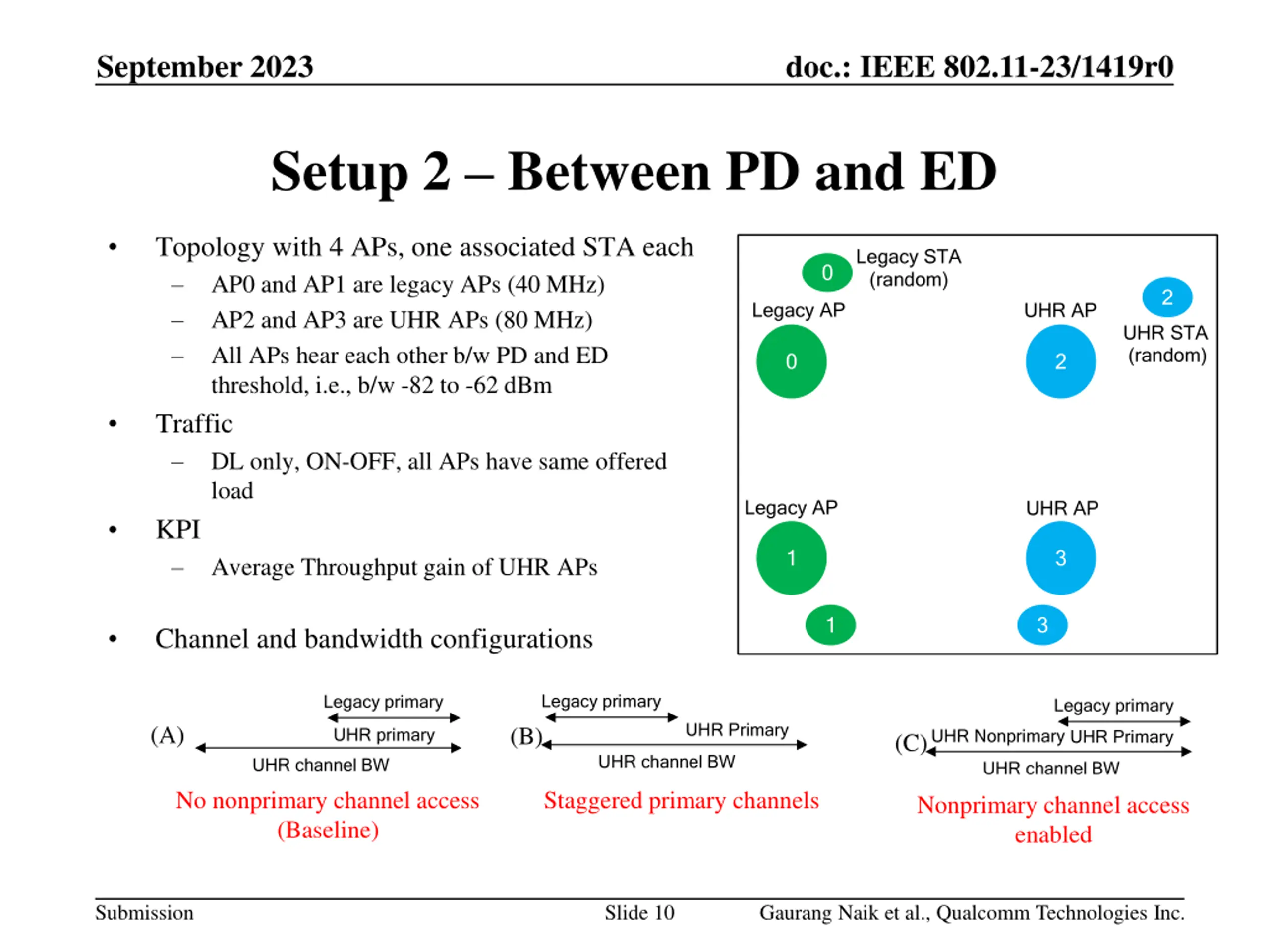 September 2023 doc.: IEEE 802.11-23/1419r0 Setup 2 Between PD and ED Topology with 4 APs, one associated STA each AP0 and AP1 are legacy APs (40 MHz) AP2 and AP3 are UHR APs (80 MHz) All APs hear each other b/w PD and ED threshold, i.e., b/w -82 to -62 dBm Traffic DL only, ON-OFF, all APs have same offered load KPI Average Throughput gain of UHR APs Legacy STA (random) 0 2 Legacy AP UHR AP UHR STA (random) 0 2 Legacy AP UHR AP 1 3 1 3 Channel and bandwidth configurations Legacy primary (B) Legacy primary Legacy primary UHR Primary (A) UHR primary UHR Nonprimary UHR Primary (C) UHR channel BW UHR channel BW UHR channel BW Nonprimary channel access enabled No nonprimary channel access (Baseline) Staggered primary channels Submission Slide 10 Gaurang Naik et al., Qualcomm Technologies Inc.