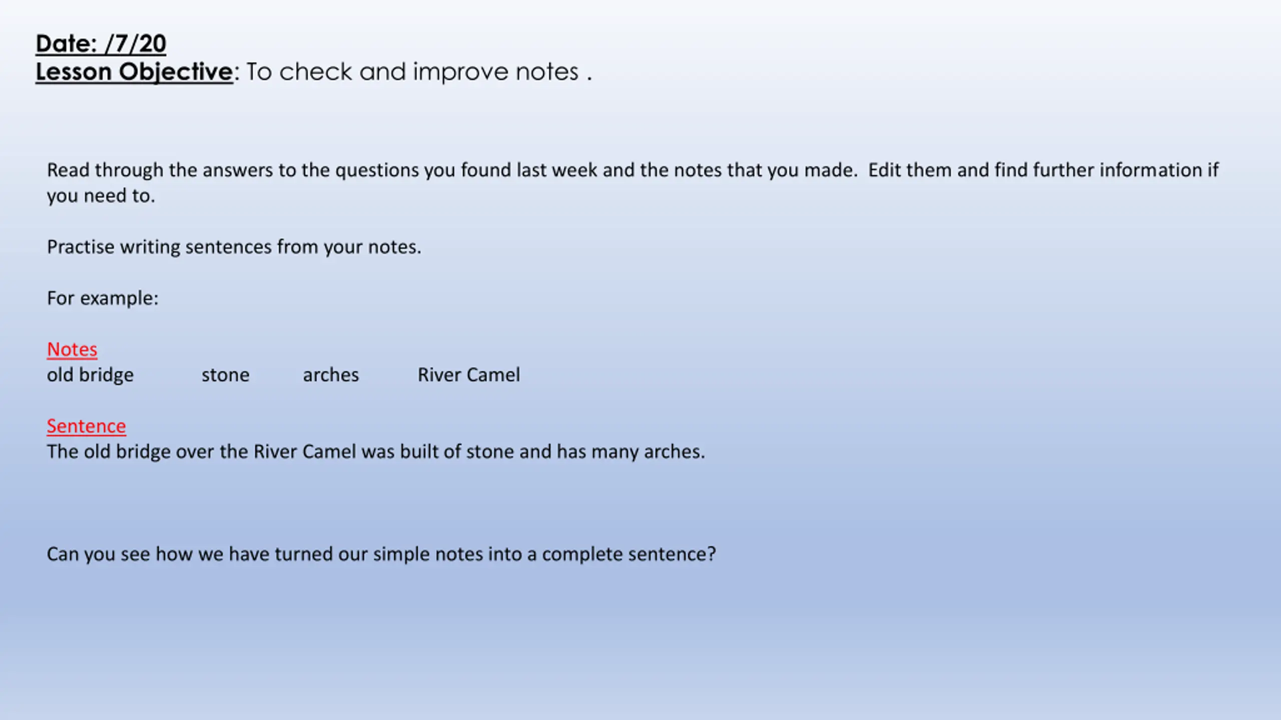 Date: /7/20 Lesson Objective: To check and improve notes . Read through the answers to the questions you found last week and the notes that you made. Edit them and find further information if you need to. Practise writing sentences from your notes. For example: Notes old bridge stone arches River Camel Sentence The old bridge over the River Camel was built of stone and has many arches. Can you see how we have turned our simple notes into a complete sentence?