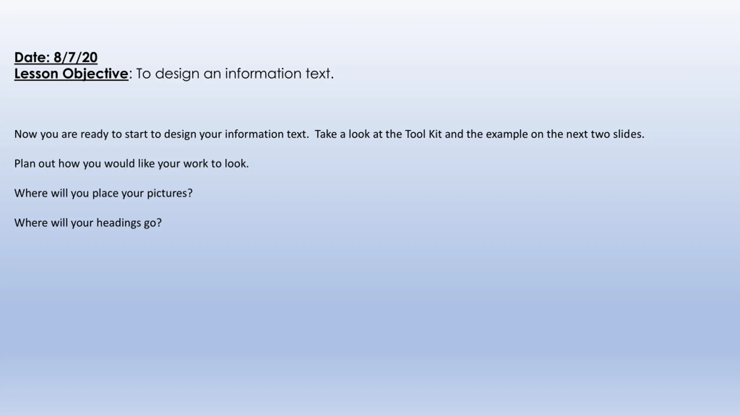 Date: 8/7/20 Lesson Objective: To design an information text. Now you are ready to start to design your information text. Take a look at the Tool Kit and the example on the next two slides. Plan out how you would like your work to look. Where will you place your pictures? Where will your headings go?