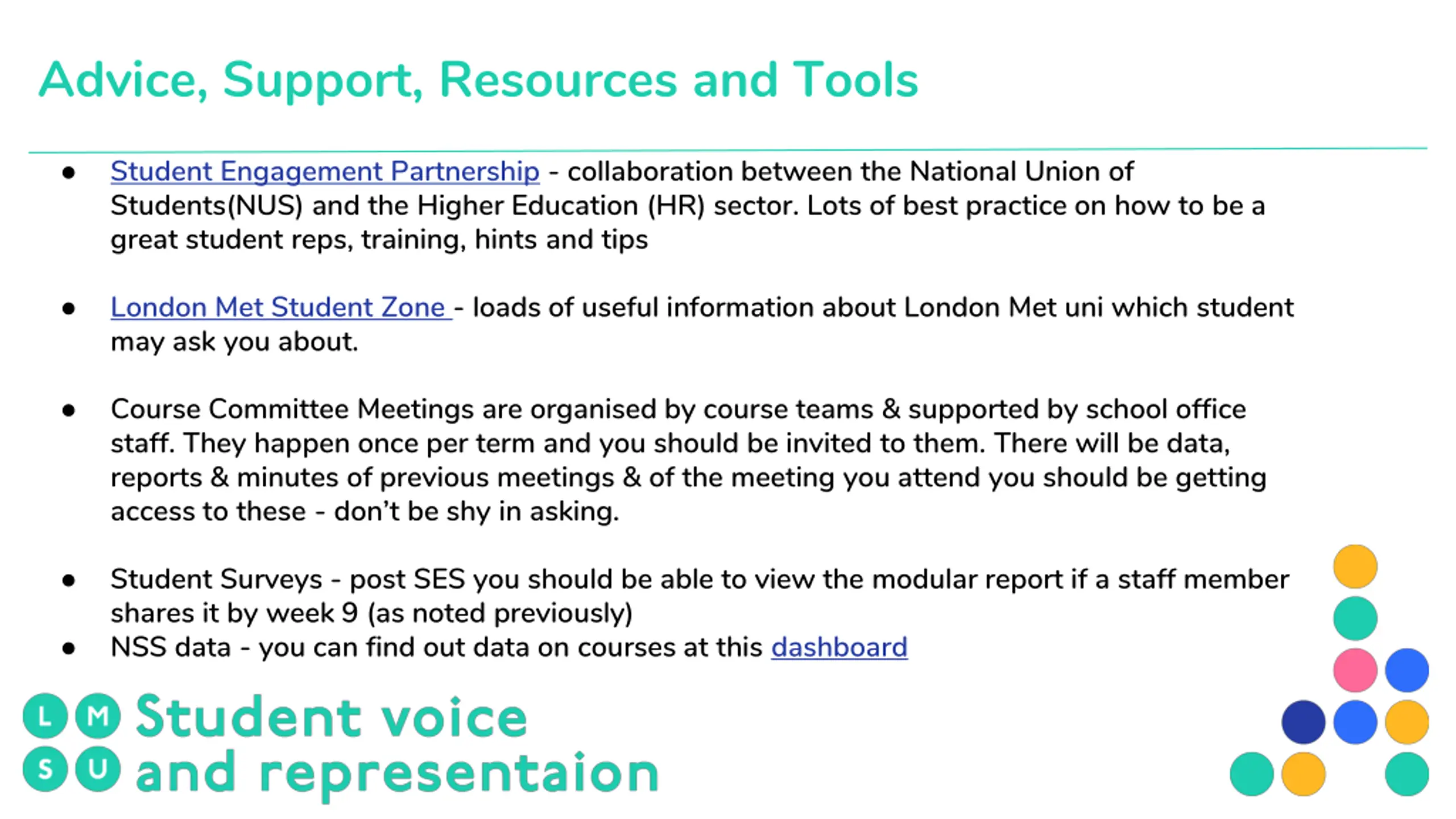 Advice, Support, Resources and Tools Student Engagement Partnership - collaboration between the National Union of Students(NUS) and the Higher Education (HR) sector. Lots of best practice on how to be a great student reps, training, hints and tips London Met Student Zone - loads of useful information about London Met uni which student may ask you about. Course Committee Meetings are organised by course teams & supported by school office staff. They happen once per term and you should be invited to them. There will be data, reports & minutes of previous meetings & of the meeting you attend you should be getting access to these - don t be shy in asking. Student Surveys - post SES you should be able to view the modular report if a staff member shares it by week 9 (as noted previously) NSS data - you can find out data on courses at this dashboard