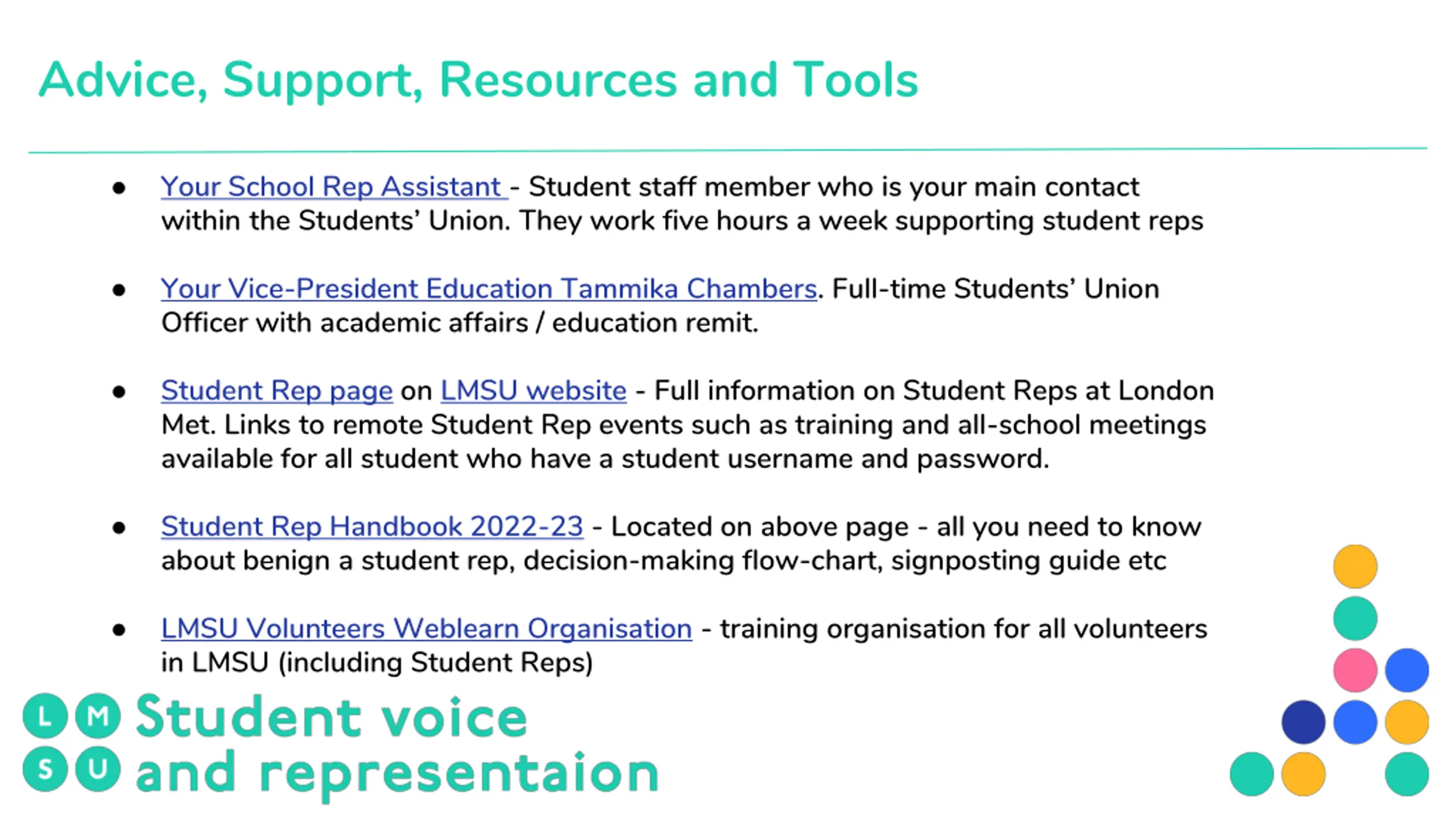 Advice, Support, Resources and Tools Your School Rep Assistant - Student staff member who is your main contact within the Students Union. They work five hours a week supporting student reps Your Vice-President Education Tammika Chambers. Full-time Students Union Officer with academic affairs / education remit. Student Rep page on LMSU website - Full information on Student Reps at London Met. Links to remote Student Rep events such as training and all-school meetings available for all student who have a student username and password. Student Rep Handbook 2022-23 - Located on above page - all you need to know about benign a student rep, decision-making flow-chart, signposting guide etc LMSU Volunteers Weblearn Organisation - training organisation for all volunteers in LMSU (including Student Reps)