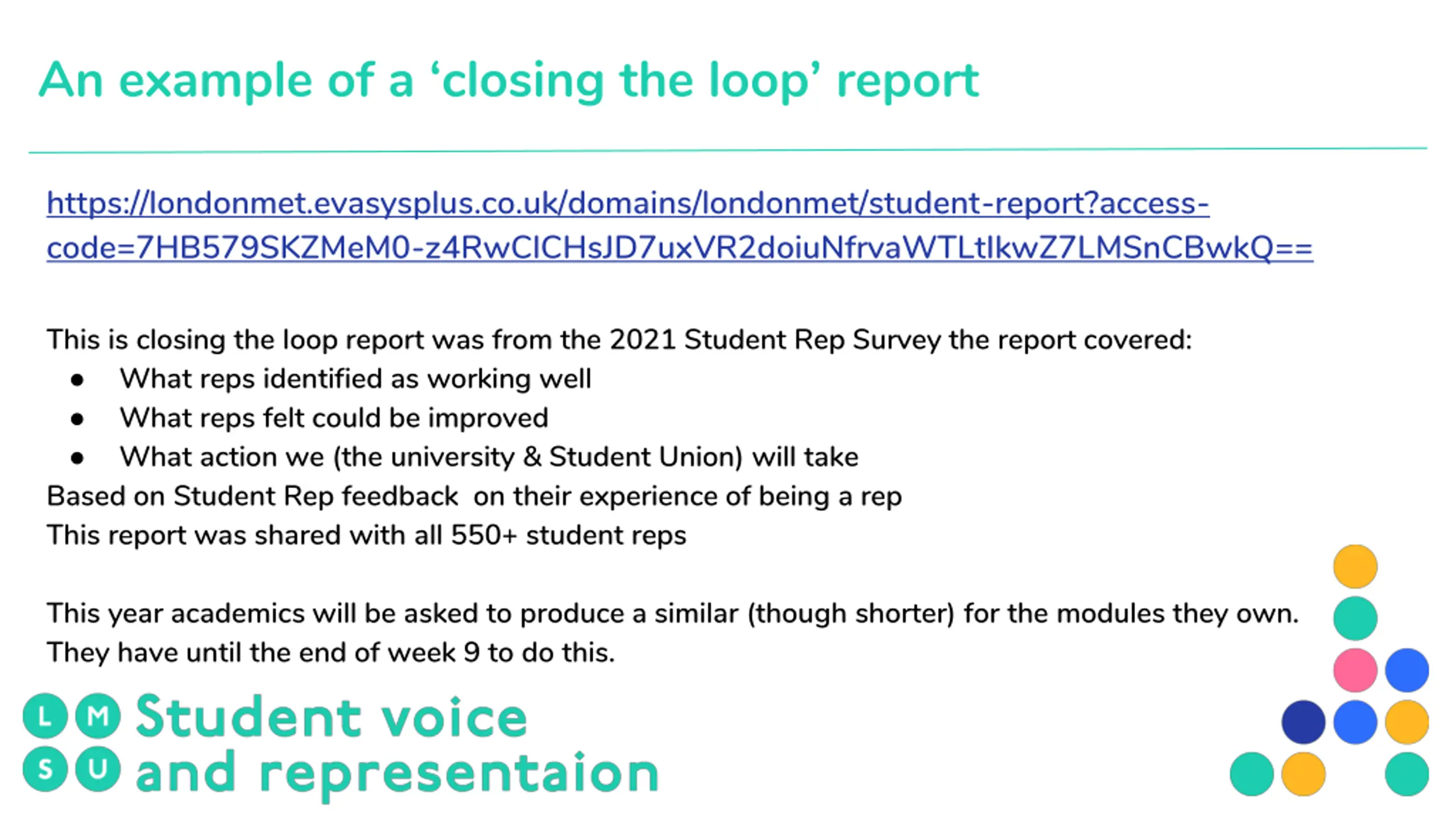 An example of a closing the loop report https://londonmet.evasysplus.co.uk/domains/londonmet/student-report?access- code=7HB579SKZMeM0-z4RwClCHsJD7uxVR2doiuNfrvaWTLtIkwZ7LMSnCBwkQ== This is closing the loop report was from the 2021 Student Rep Survey the report covered: What reps identified as working well What reps felt could be improved What action we (the university & Student Union) will take Based on Student Rep feedback on their experience of being a rep This report was shared with all 550+ student reps This year academics will be asked to produce a similar (though shorter) for the modules they own. They have until the end of week 9 to do this.