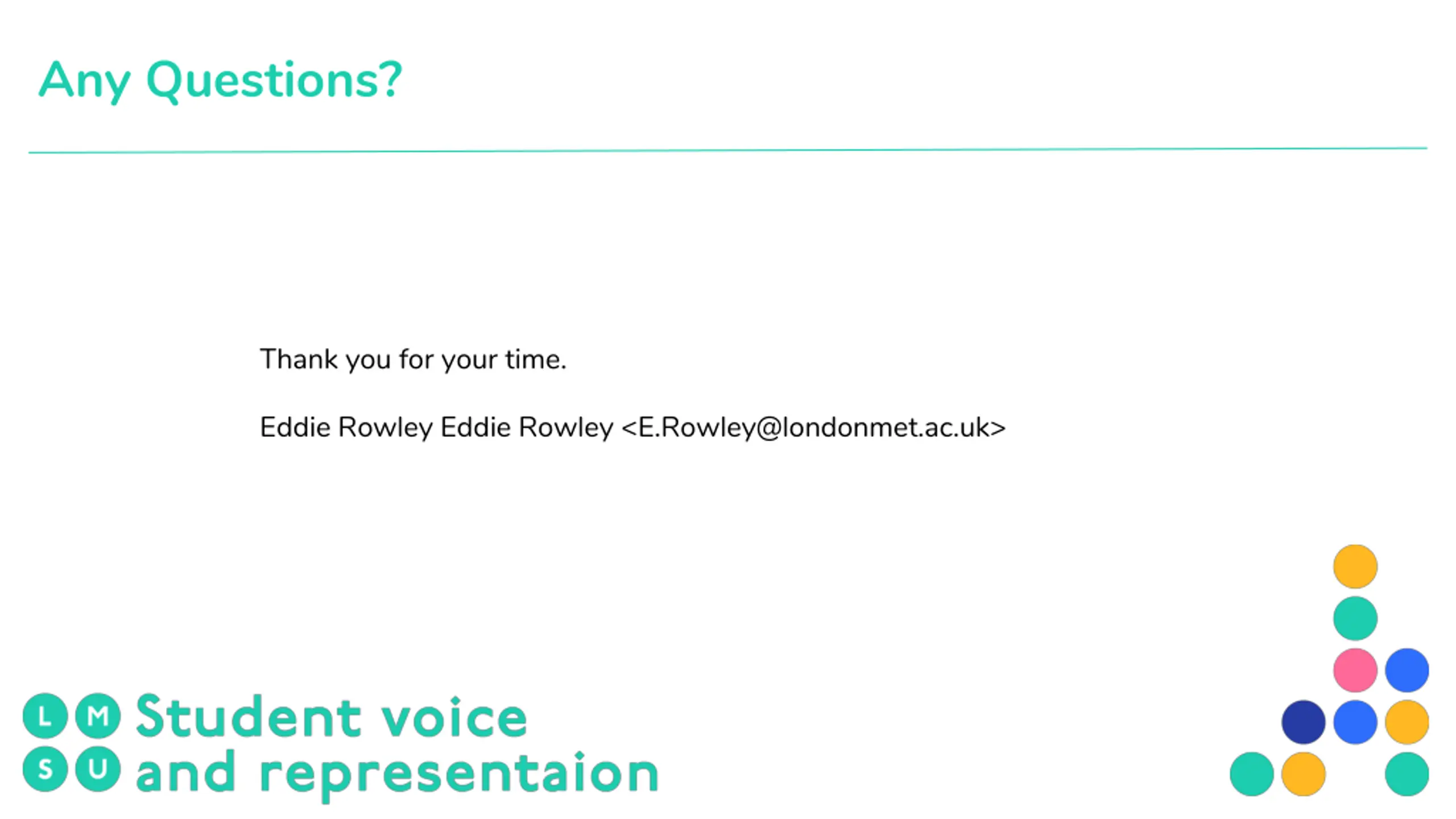 Any Questions? Thank you for your time. Eddie Rowley Eddie Rowley <E.Rowley@londonmet.ac.uk>