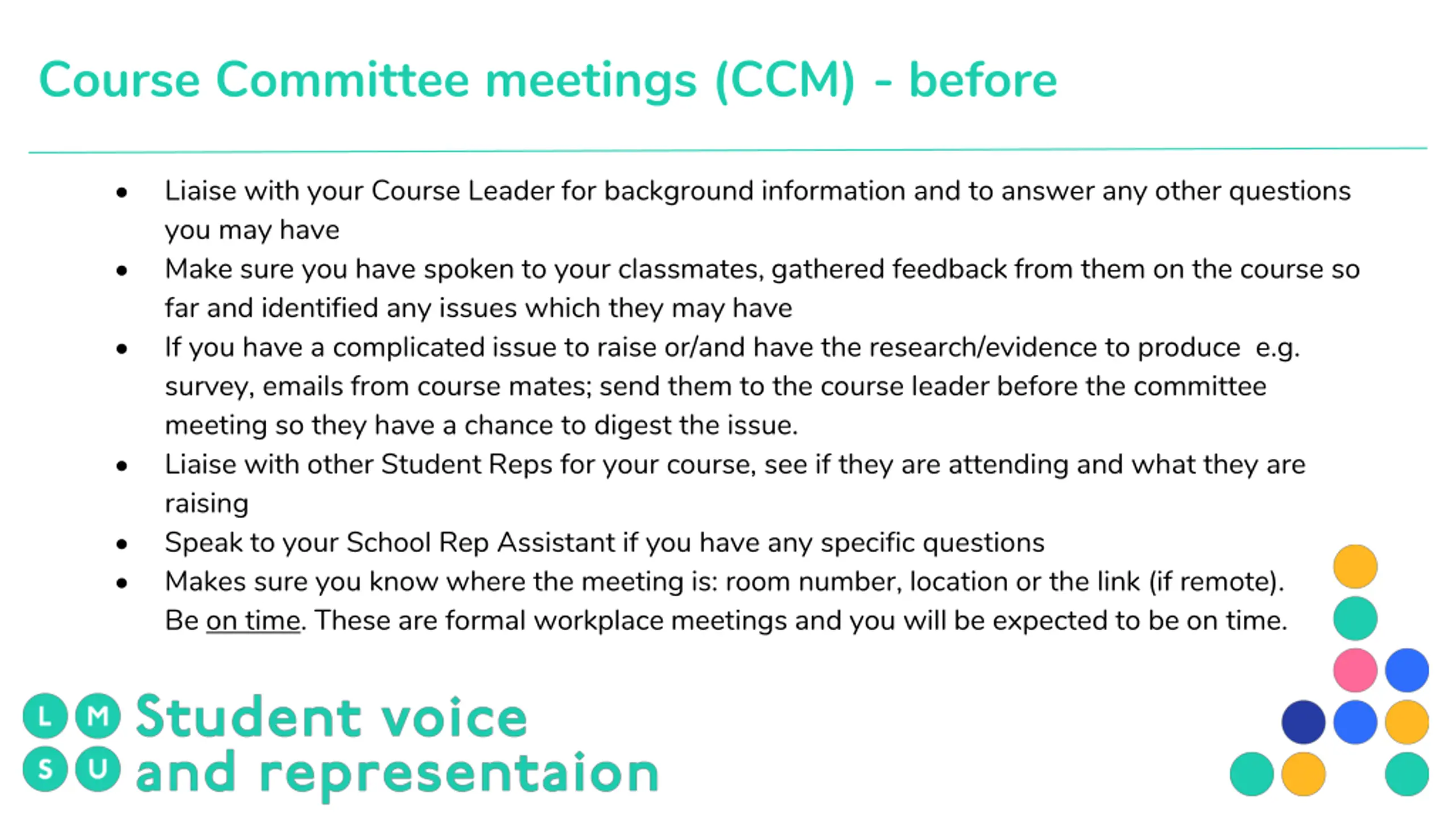 Course Committee meetings (CCM) - before Liaise with your Course Leader for background information and to answer any other questions you may have Make sure you have spoken to your classmates, gathered feedback from them on the course so far and identified any issues which they may have If you have a complicated issue to raise or/and have the research/evidence to produce e.g. survey, emails from course mates; send them to the course leader before the committee meeting so they have a chance to digest the issue. Liaise with other Student Reps for your course, see if they are attending and what they are raising Speak to your School Rep Assistant if you have any specific questions Makes sure you know where the meeting is: room number, location or the link (if remote). Be on time. These are formal workplace meetings and you will be expected to be on time.