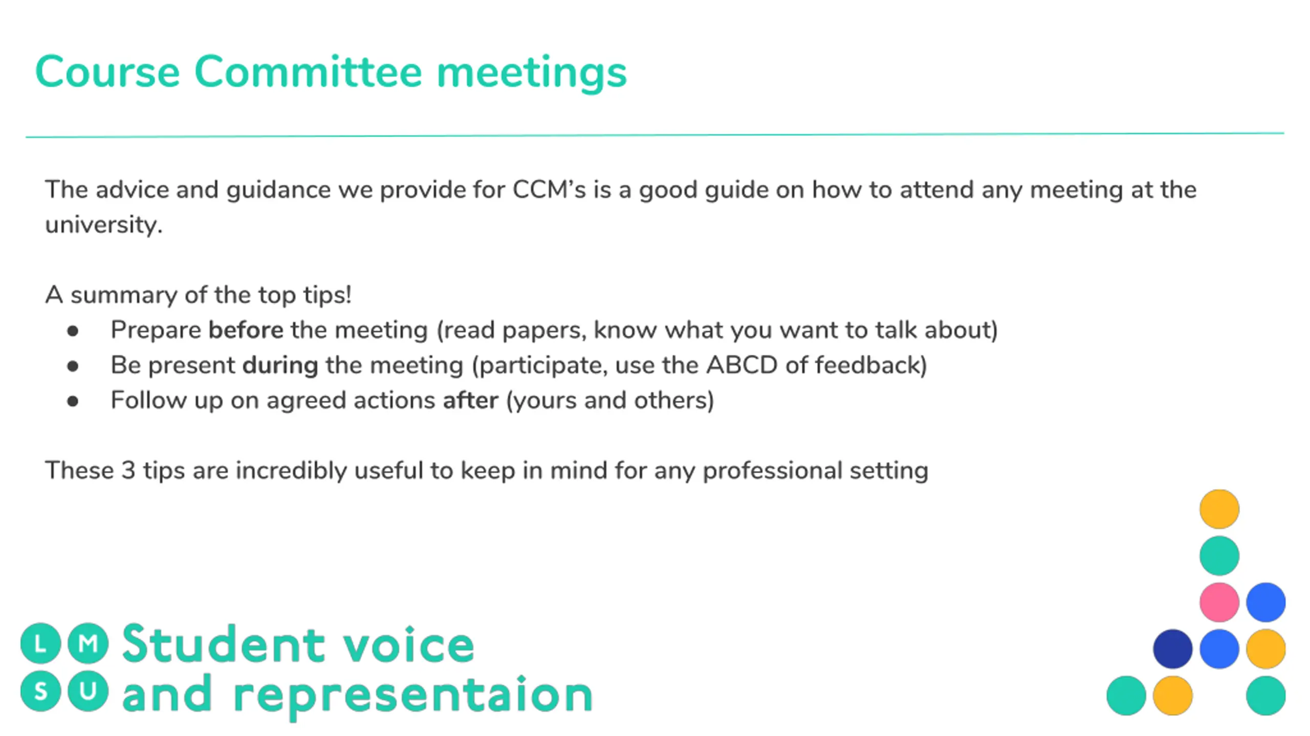 Course Committee meetings The advice and guidance we provide for CCM s is a good guide on how to attend any meeting at the university. A summary of the top tips! Prepare before the meeting (read papers, know what you want to talk about) Be present during the meeting (participate, use the ABCD of feedback) Follow up on agreed actions after (yours and others) These 3 tips are incredibly useful to keep in mind for any professional setting