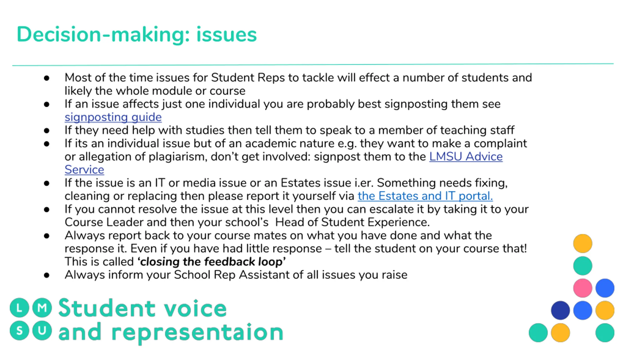 Decision-making: issues Most of the time issues for Student Reps to tackle will effect a number of students and likely the whole module or course If an issue affects just one individual you are probably best signposting them see signposting guide If they need help with studies then tell them to speak to a member of teaching staff If its an individual issue but of an academic nature e.g. they want to make a complaint or allegation of plagiarism, don t get involved: signpost them to the LMSU Advice Service If the issue is an IT or media issue or an Estates issue i.er. Something needs fixing, cleaning or replacing then please report it yourself via the Estates and IT portal. If you cannot resolve the issue at this level then you can escalate it by taking it to your Course Leader and then your school s Head of Student Experience. Always report back to your course mates on what you have done and what the response it. Even if you have had little response tell the student on your course that! This is called closing the feedback loop Always inform your School Rep Assistant of all issues you raise