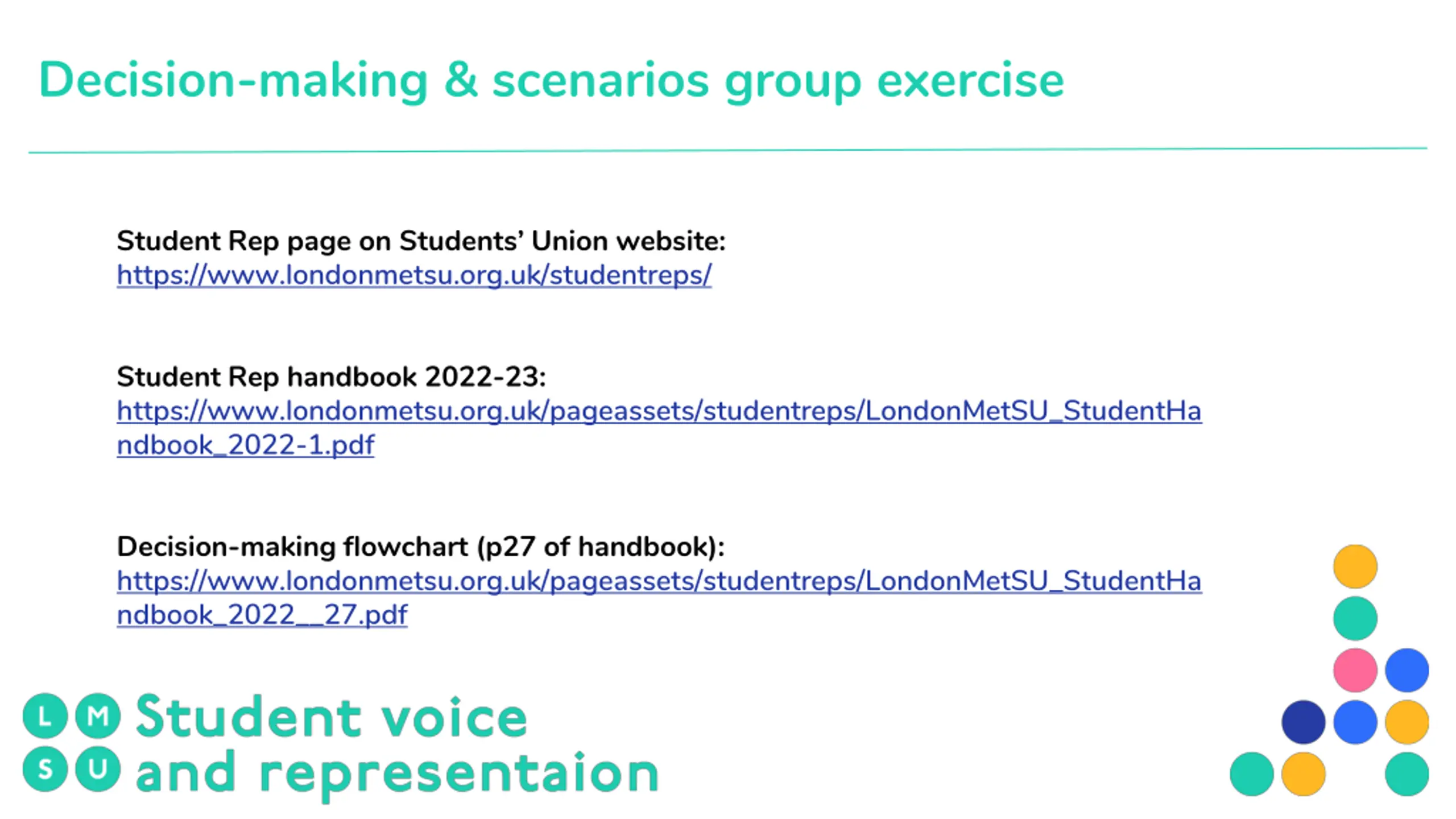 Decision-making & scenarios group exercise Student Rep page on Students Union website: https://www.londonmetsu.org.uk/studentreps/ Student Rep handbook 2022-23: https://www.londonmetsu.org.uk/pageassets/studentreps/LondonMetSU_StudentHa ndbook_2022-1.pdf Decision-making flowchart (p27 of handbook): https://www.londonmetsu.org.uk/pageassets/studentreps/LondonMetSU_StudentHa ndbook_2022__27.pdf