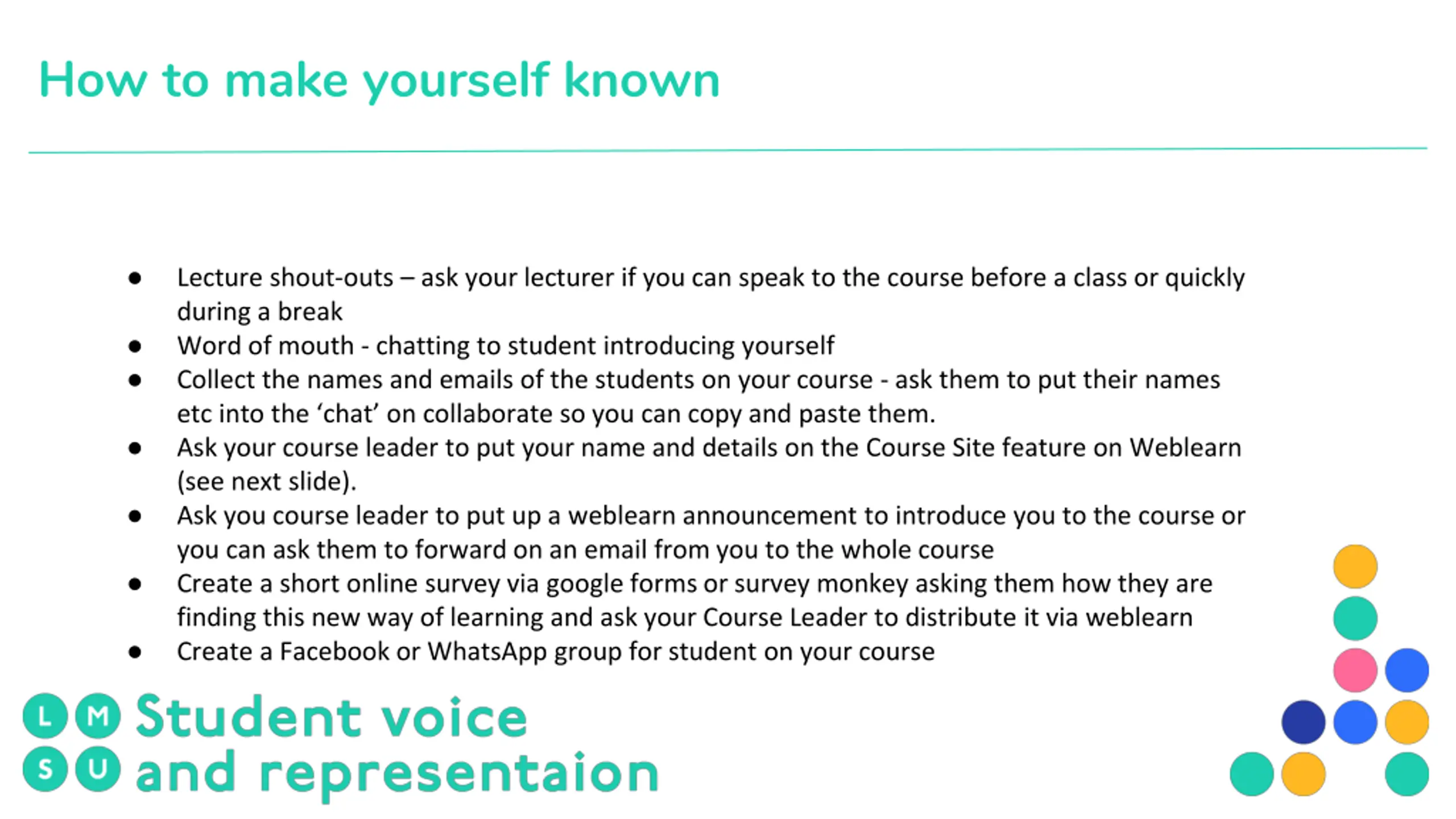 How to make yourself known Lecture shout-outs ask your lecturer if you can speak to the course before a class or quickly during a break Word of mouth - chatting to student introducing yourself Collect the names and emails of the students on your course - ask them to put their names etc into the chat on collaborate so you can copy and paste them. Ask your course leader to put your name and details on the Course Site feature on Weblearn (see next slide). Ask you course leader to put up a weblearn announcement to introduce you to the course or you can ask them to forward on an email from you to the whole course Create a short online survey via google forms or survey monkey asking them how they are finding this new way of learning and ask your Course Leader to distribute it via weblearn Create a Facebook or WhatsApp group for student on your course