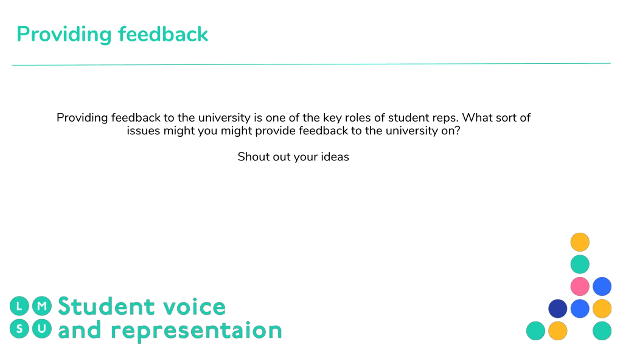 Providing feedback Providing feedback to the university is one of the key roles of student reps. What sort of issues might you might provide feedback to the university on? Shout out your ideas