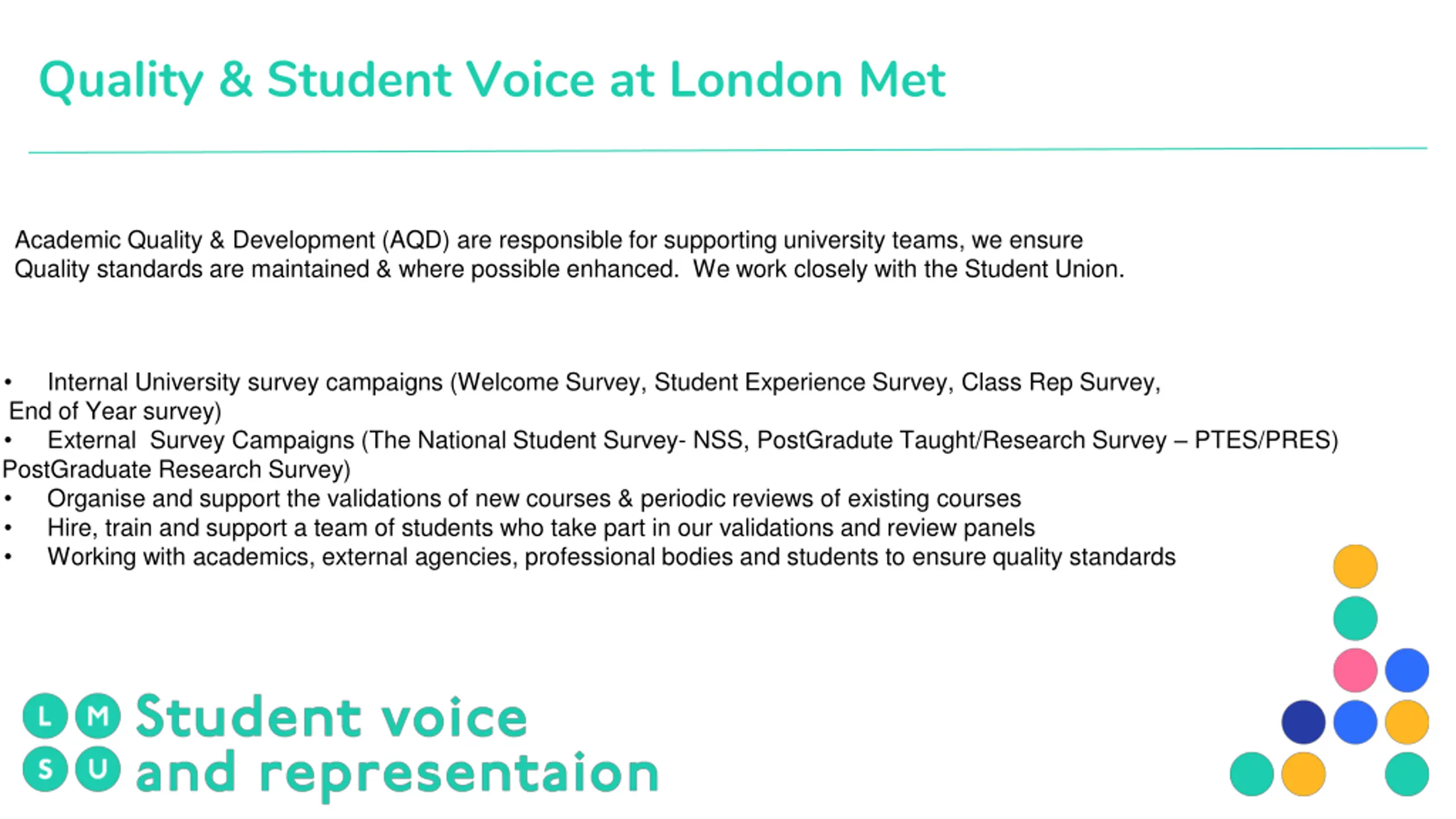 Quality & Student Voice at London Met Academic Quality & Development (AQD) are responsible for supporting university teams, we ensure Quality standards are maintained & where possible enhanced. We work closely with the Student Union. Internal University survey campaigns (Welcome Survey, Student Experience Survey, Class Rep Survey, End of Year survey) External Survey Campaigns (The National Student Survey- NSS, PostGradute Taught/Research Survey PTES/PRES) PostGraduate Research Survey) Organise and support the validations of new courses & periodic reviews of existing courses Hire, train and support a team of students who take part in our validations and review panels Working with academics, external agencies, professional bodies and students to ensure quality standards