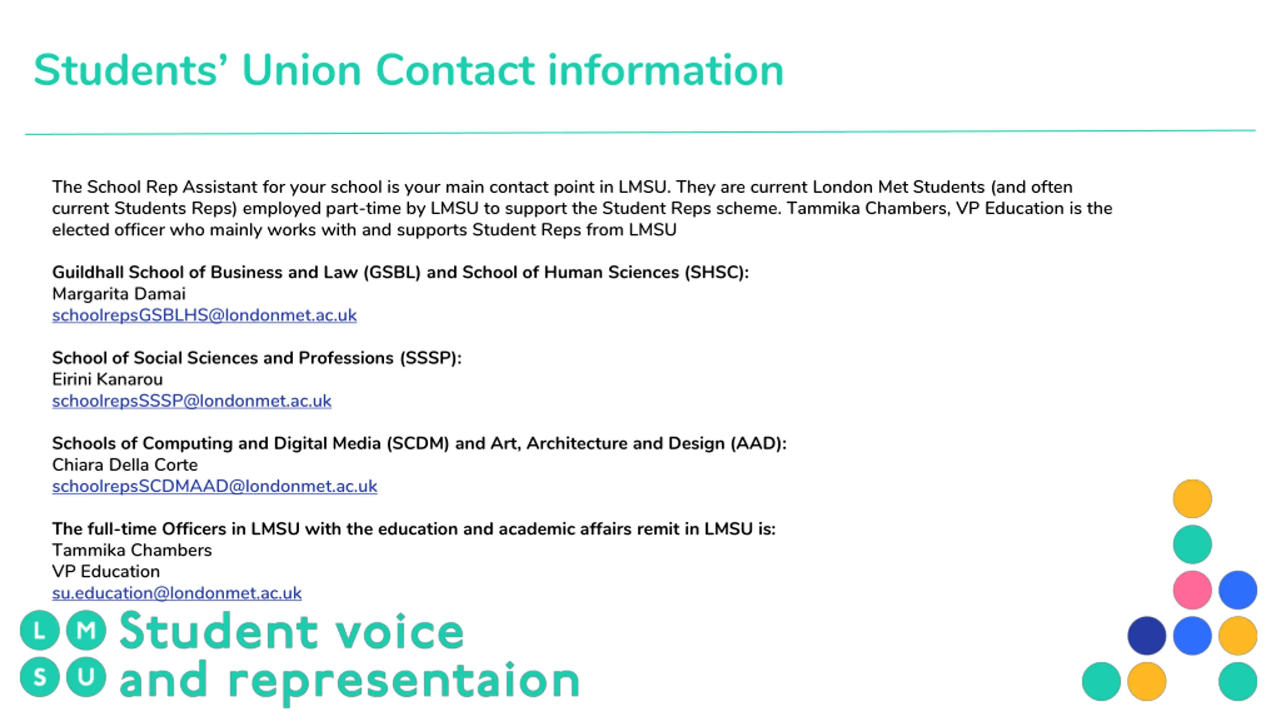 Students Union Contact information The School Rep Assistant for your school is your main contact point in LMSU. They are current London Met Students (and often current Students Reps) employed part-time by LMSU to support the Student Reps scheme. Tammika Chambers, VP Education is the elected officer who mainly works with and supports Student Reps from LMSU Guildhall School of Business and Law (GSBL) and School of Human Sciences (SHSC): Margarita Damai schoolrepsGSBLHS@londonmet.ac.uk School of Social Sciences and Professions (SSSP): Eirini Kanarou schoolrepsSSSP@londonmet.ac.uk Schools of Computing and Digital Media (SCDM) and Art, Architecture and Design (AAD): Chiara Della Corte schoolrepsSCDMAAD@londonmet.ac.uk The full-time Officers in LMSU with the education and academic affairs remit in LMSU is: Tammika Chambers VP Education su.education@londonmet.ac.uk