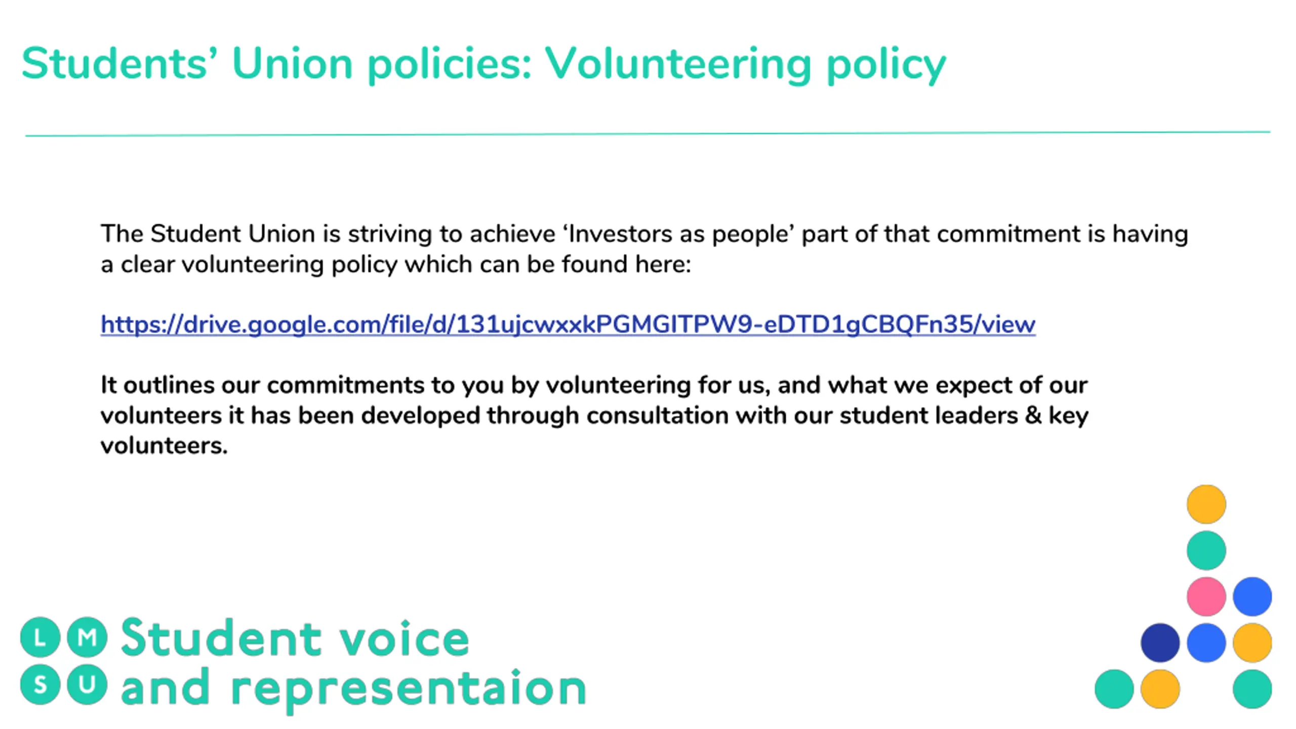Students Union policies: Volunteering policy The Student Union is striving to achieve Investors as people part of that commitment is having a clear volunteering policy which can be found here: https://drive.google.com/file/d/131ujcwxxkPGMGITPW9-eDTD1gCBQFn35/view It outlines our commitments to you by volunteering for us, and what we expect of our volunteers it has been developed through consultation with our student leaders & key volunteers.