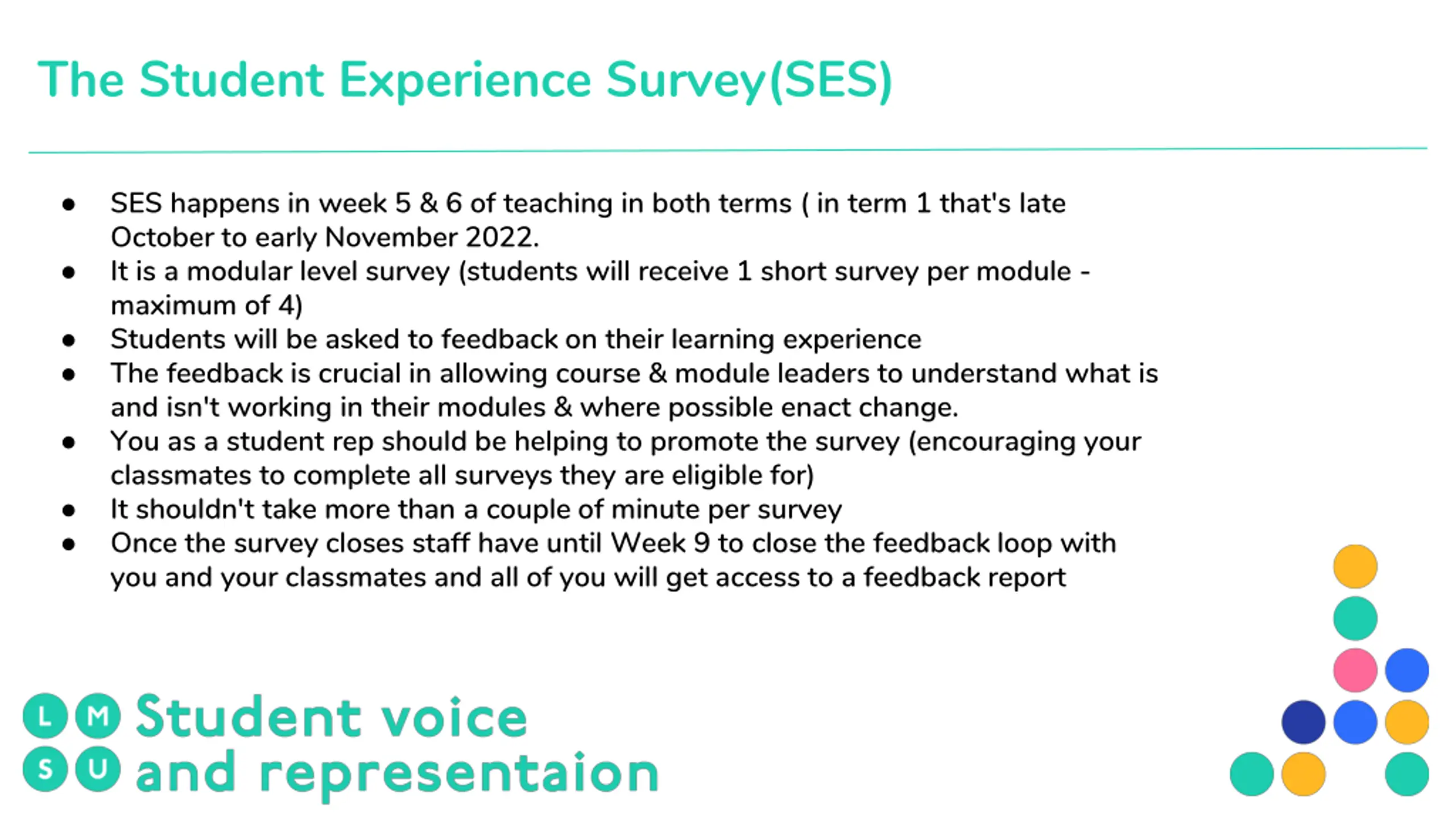 The Student Experience Survey(SES) SES happens in week 5 & 6 of teaching in both terms ( in term 1 that's late October to early November 2022. It is a modular level survey (students will receive 1 short survey per module - maximum of 4) Students will be asked to feedback on their learning experience The feedback is crucial in allowing course & module leaders to understand what is and isn't working in their modules & where possible enact change. You as a student rep should be helping to promote the survey (encouraging your classmates to complete all surveys they are eligible for) It shouldn't take more than a couple of minute per survey Once the survey closes staff have until Week 9 to close the feedback loop with you and your classmates and all of you will get access to a feedback report
