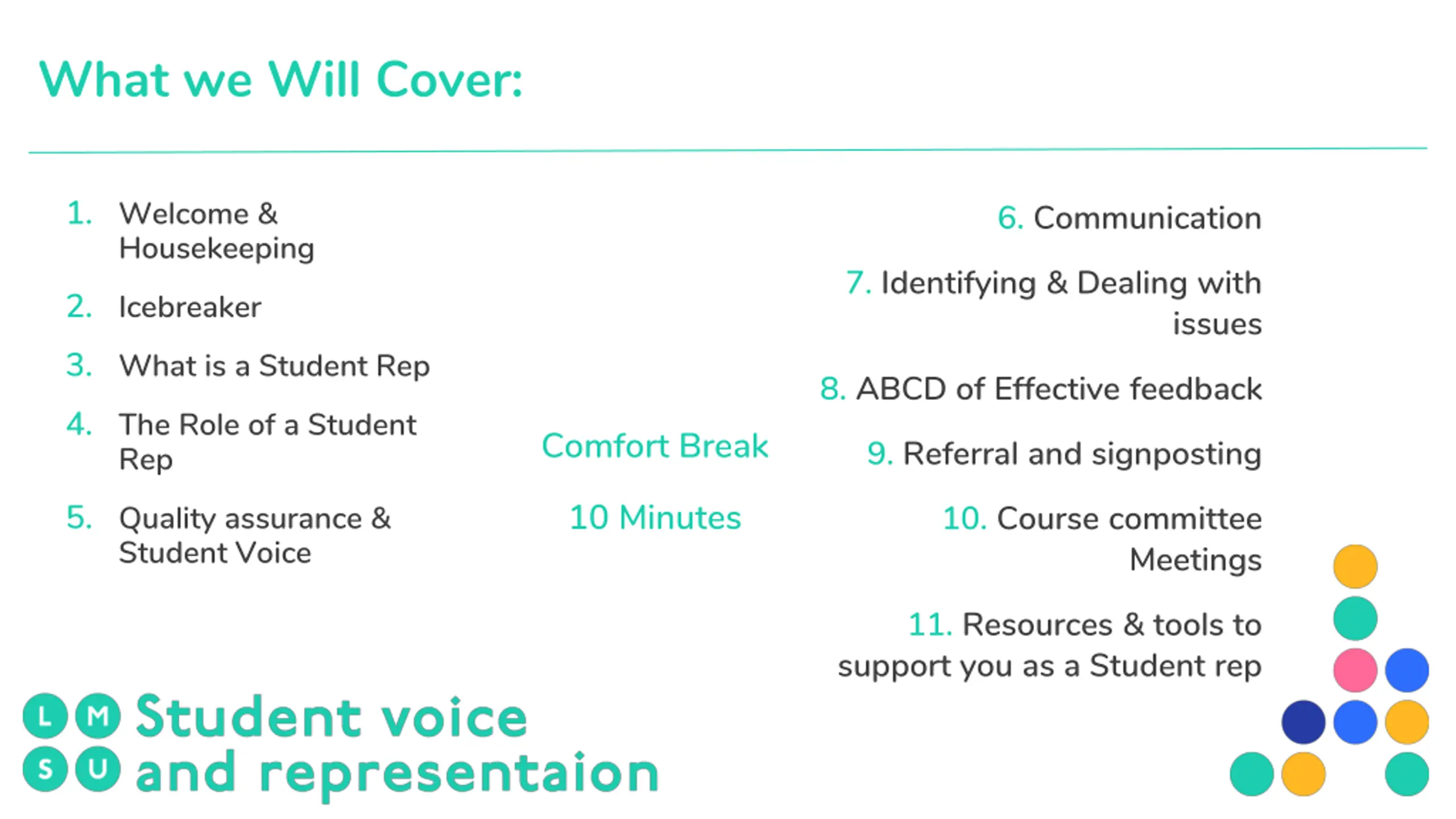 What we Will Cover: 1. Welcome & Housekeeping 2. Icebreaker 3. What is a Student Rep 4. The Role of a Student Rep 5. Quality assurance & Student Voice 6. Communication 7. Identifying & Dealing with issues 8. ABCD of Effective feedback Comfort Break 9. Referral and signposting 10 Minutes 10. Course committee Meetings 11. Resources & tools to support you as a Student rep