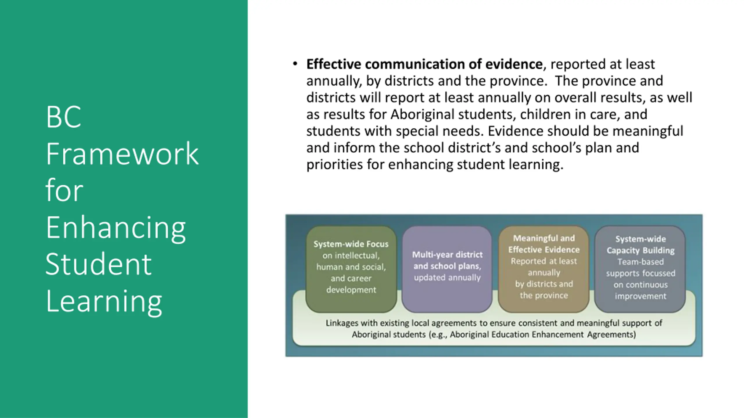 Effective communication of evidence, reported at least annually, by districts and the province. The province and districts will report at least annually on overall results, as well as results for Aboriginal students, children in care, and students with special needs. Evidence should be meaningful and inform the school district s and school s plan and priorities for enhancing student learning. BC Framework for Enhancing Student Learning
