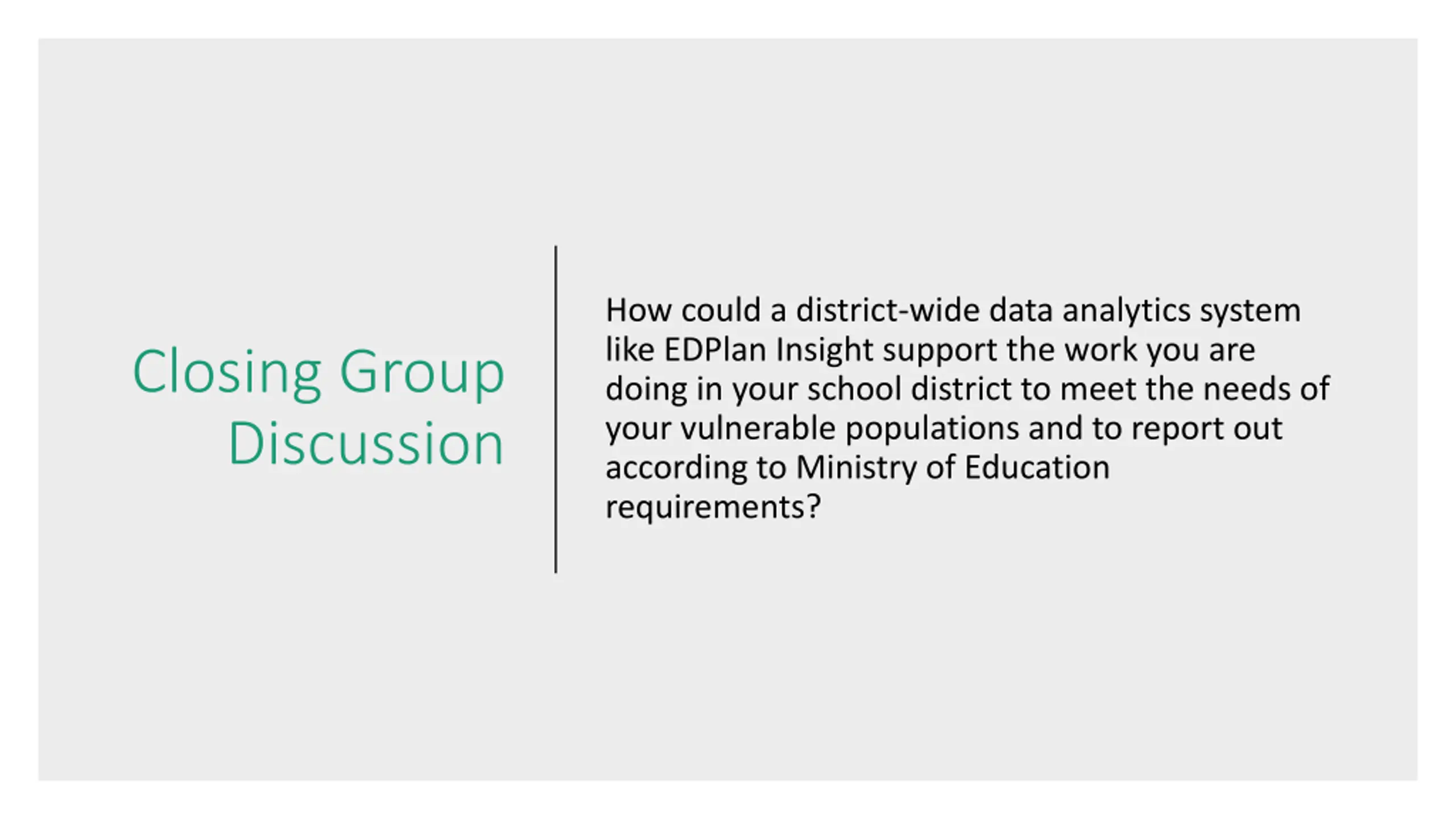 How could a district-wide data analytics system like EDPlan Insight support the work you are doing in your school district to meet the needs of your vulnerable populations and to report out according to Ministry of Education requirements? Closing Group Discussion