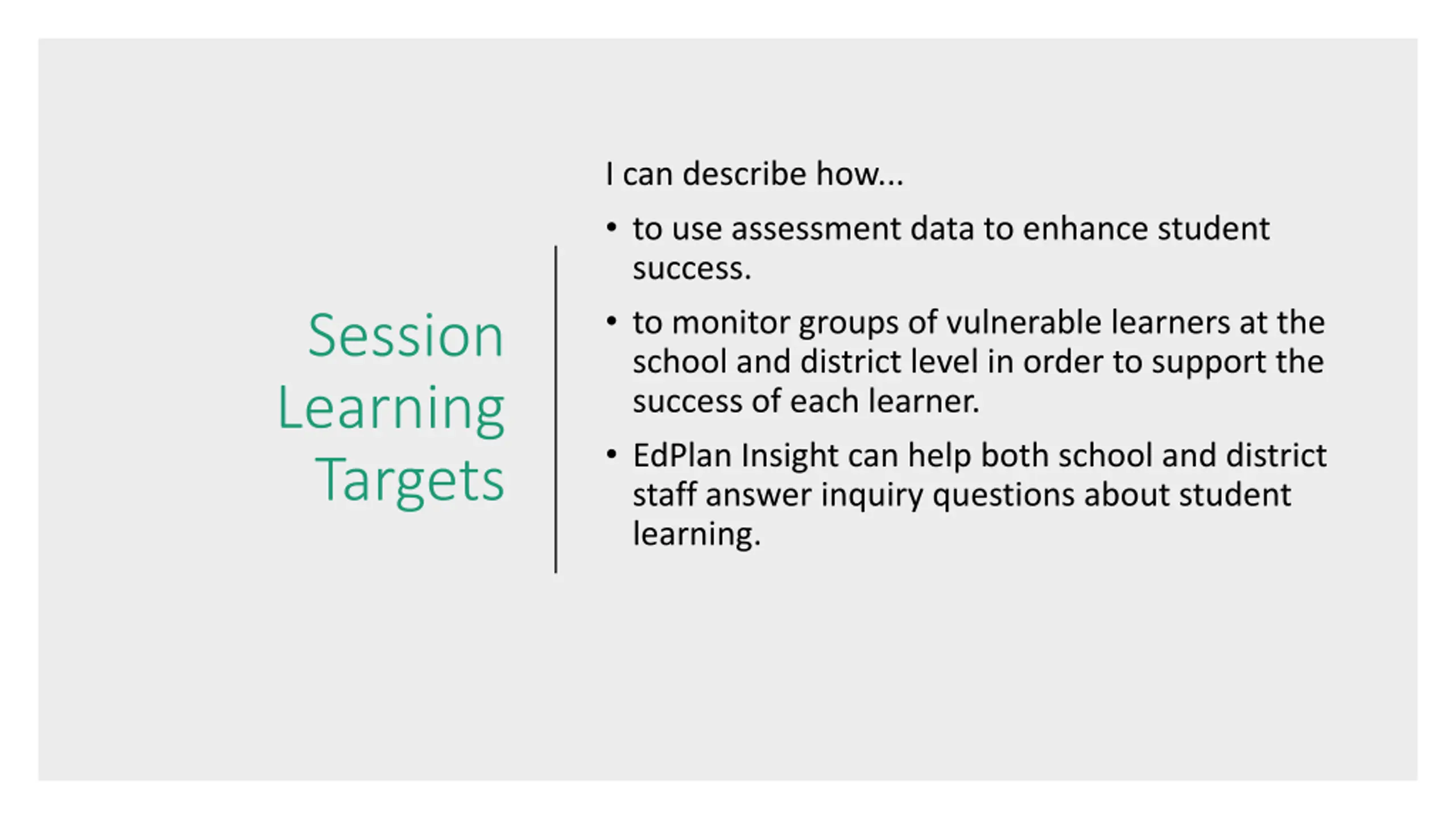I can describe how... to use assessment data to enhance student success. to monitor groups of vulnerable learners at the school and district level in order to support the success of each learner. EdPlan Insight can help both school and district staff answer inquiry questions about student learning. Session Learning Targets