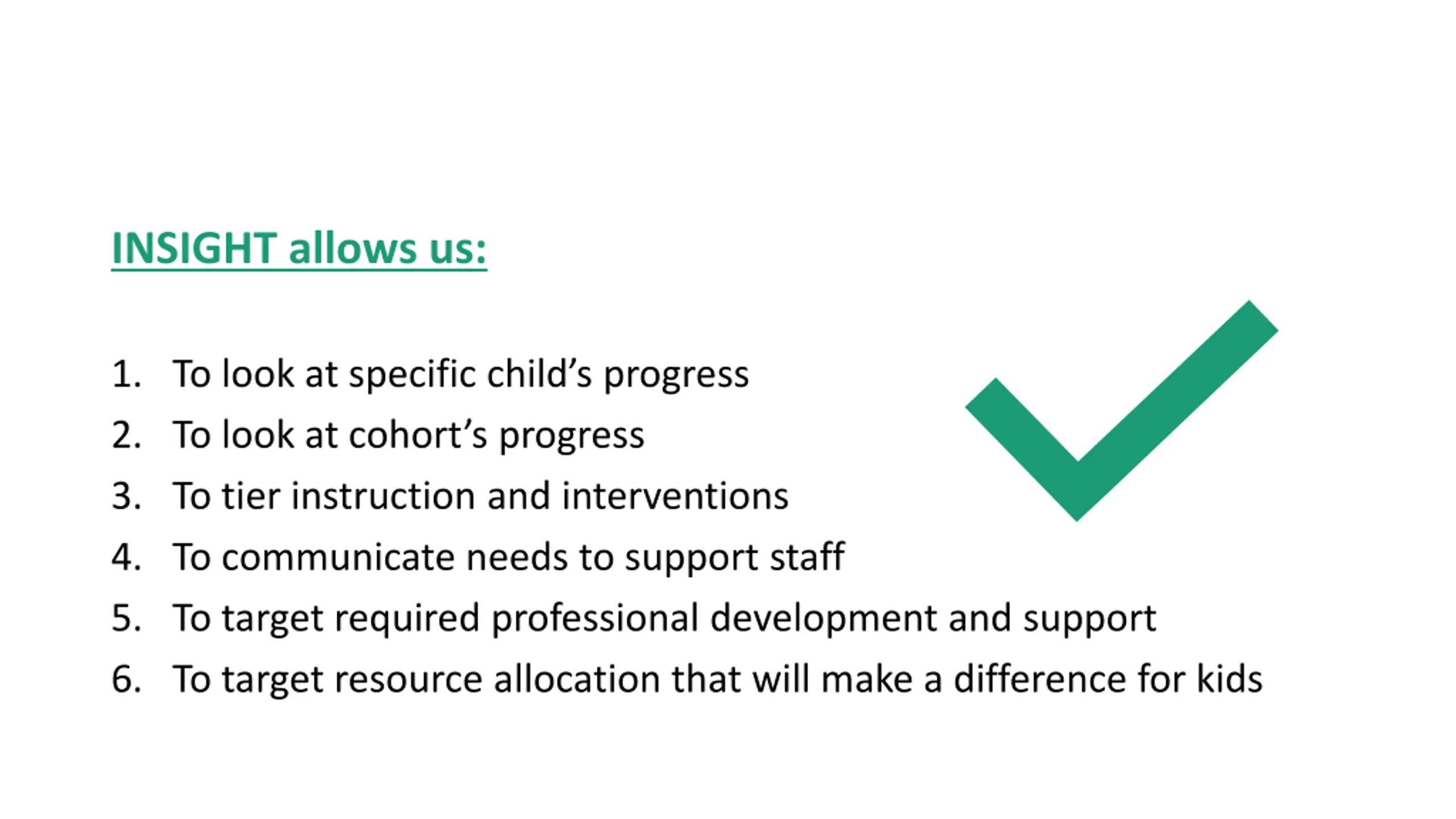 INSIGHT allows us: 1. To look at specific child s progress 2. To look at cohort s progress 3. To tier instruction and interventions 4. To communicate needs to support staff 5. To target required professional development and support 6. To target resource allocation that will make a difference for kids
