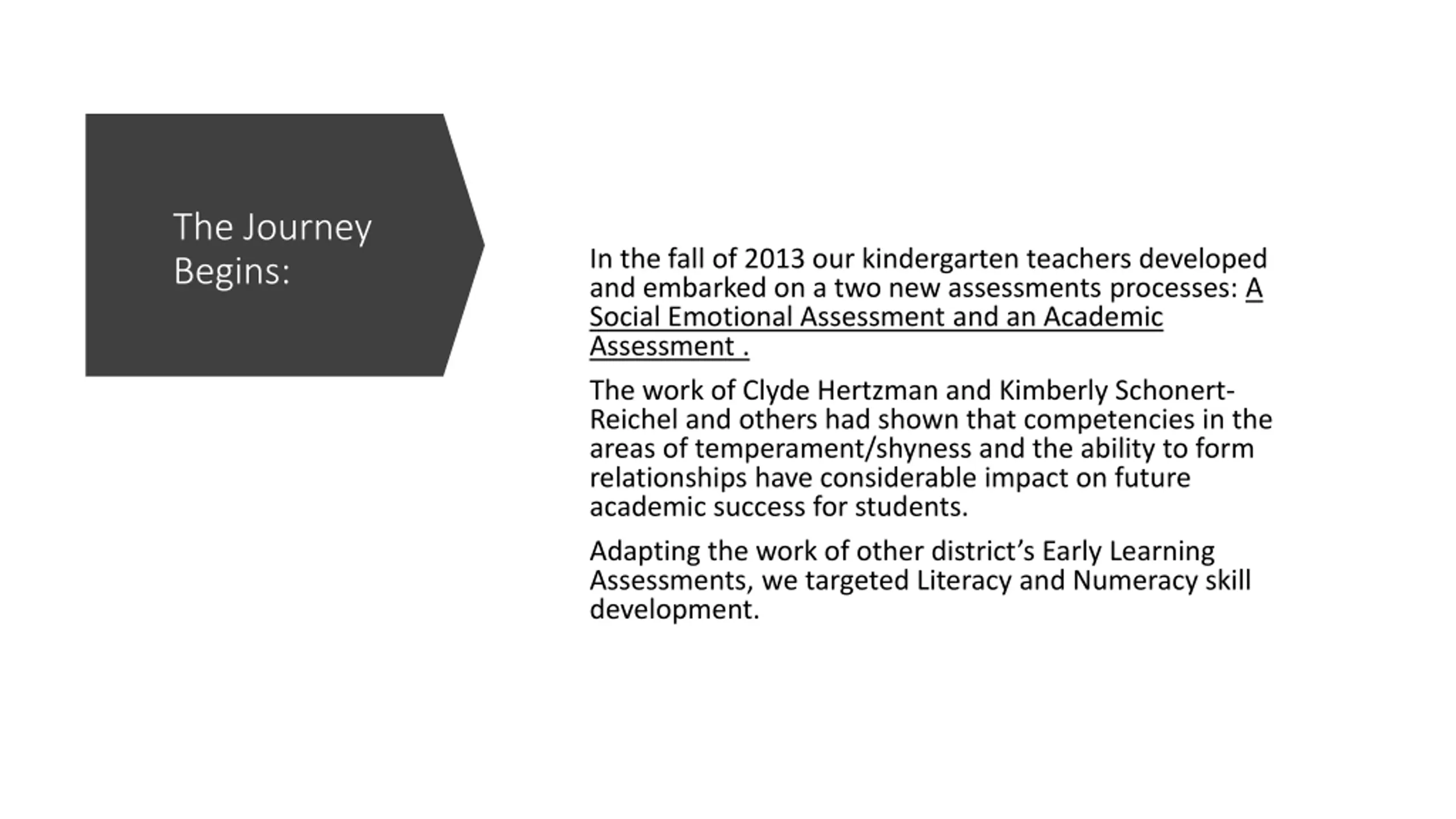 The Journey Begins: In the fall of 2013 our kindergarten teachers developed and embarked on a two new assessments processes: A Social Emotional Assessment and an Academic Assessment . The work of Clyde Hertzman and Kimberly Schonert- Reichel and others had shown that competencies in the areas of temperament/shyness and the ability to form relationships have considerable impact on future academic success for students. Adapting the work of other district s Early Learning Assessments, we targeted Literacy and Numeracy skill development.