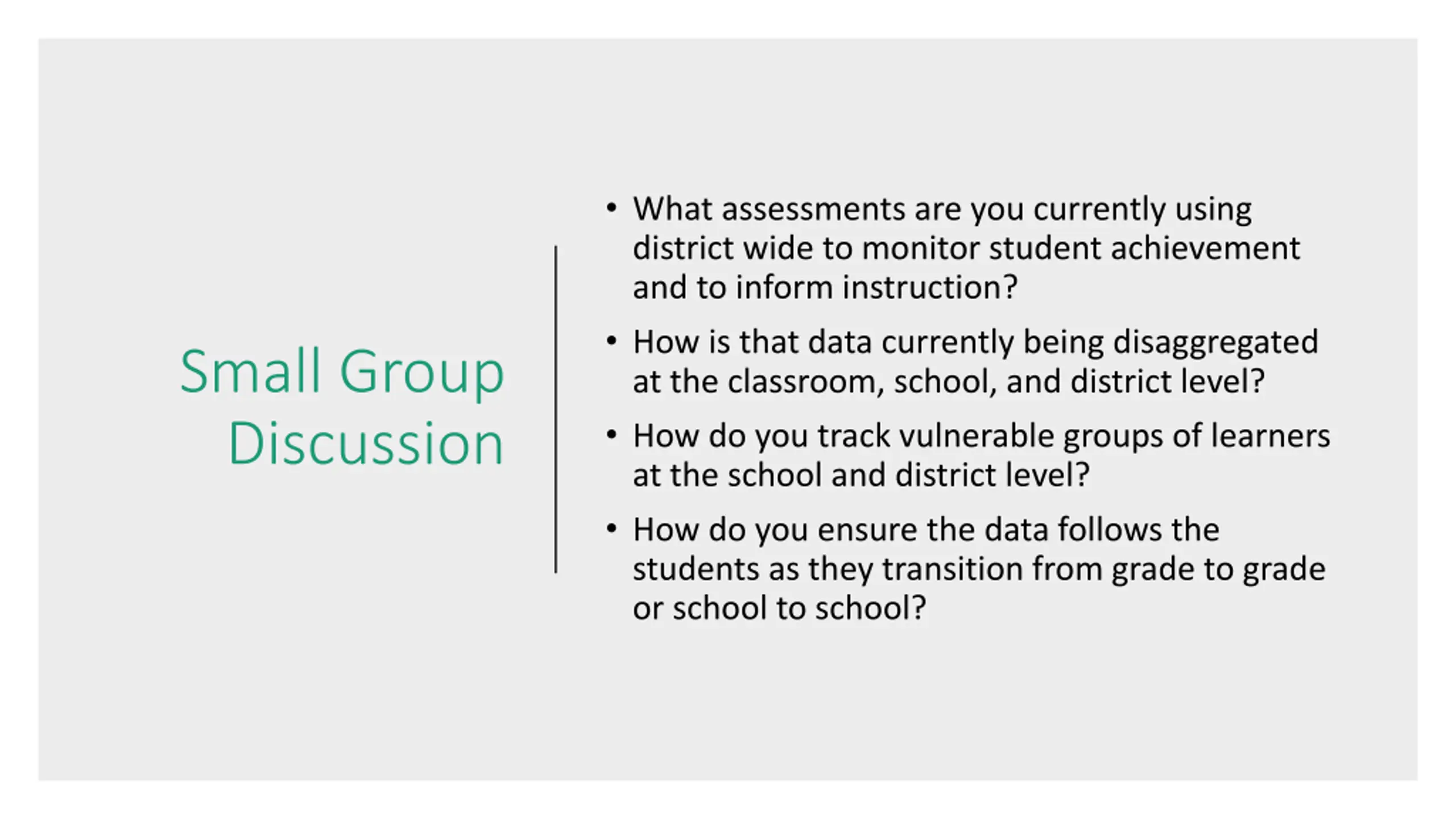 What assessments are you currently using district wide to monitor student achievement and to inform instruction? How is that data currently being disaggregated at the classroom, school, and district level? How do you track vulnerable groups of learners at the school and district level? How do you ensure the data follows the students as they transition from grade to grade or school to school? Small Group Discussion
