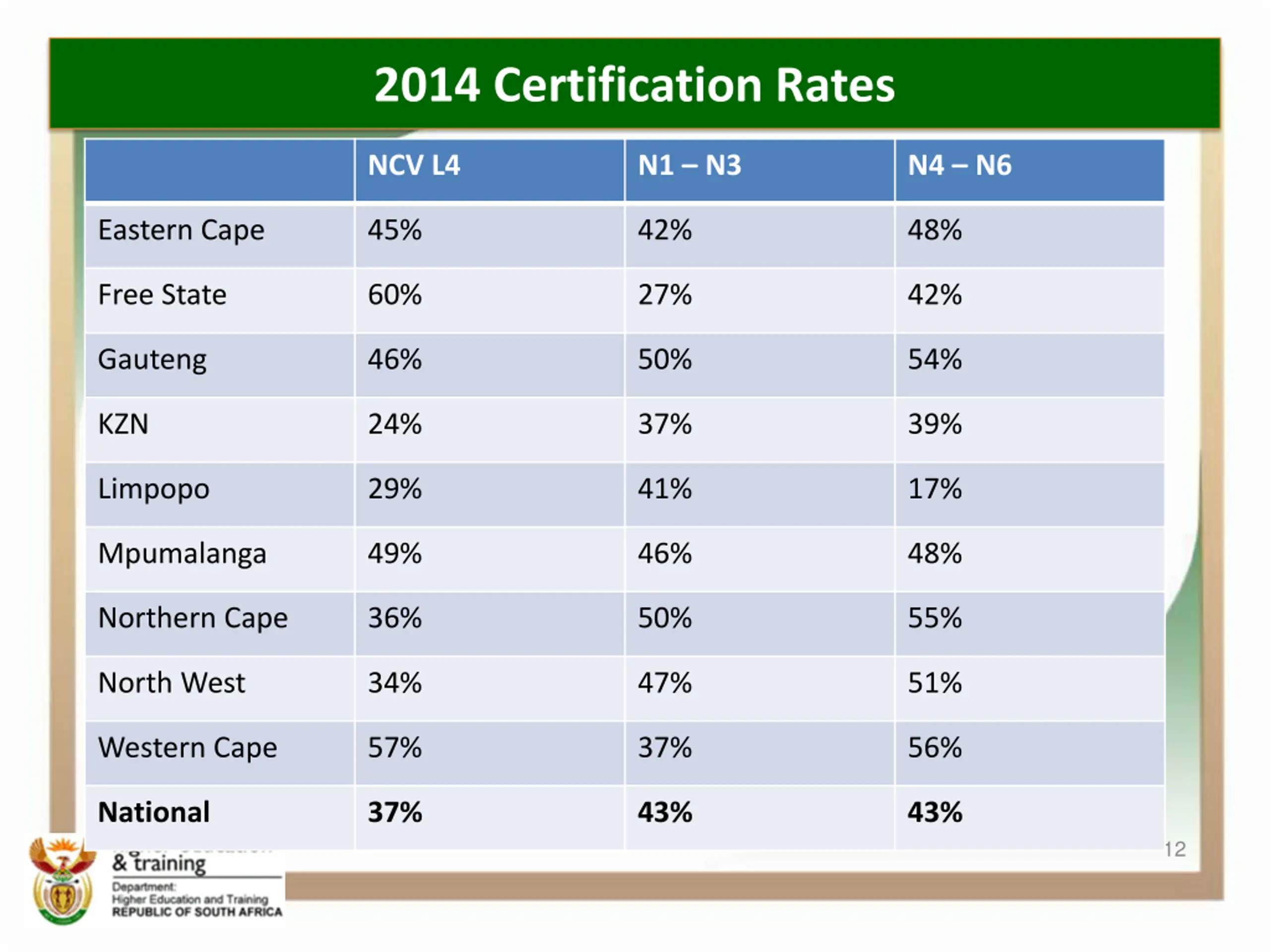 2014 Certification Rates NCV L4 N1 N3 N4 N6 Eastern Cape 45% 42% 48% Free State 60% 27% 42% Gauteng 46% 50% 54% KZN 24% 37% 39% Limpopo 29% 41% 17% Mpumalanga 49% 46% 48% Northern Cape 36% 50% 55% North West 34% 47% 51% Western Cape 57% 37% 56% National 37% 43% 43% 12