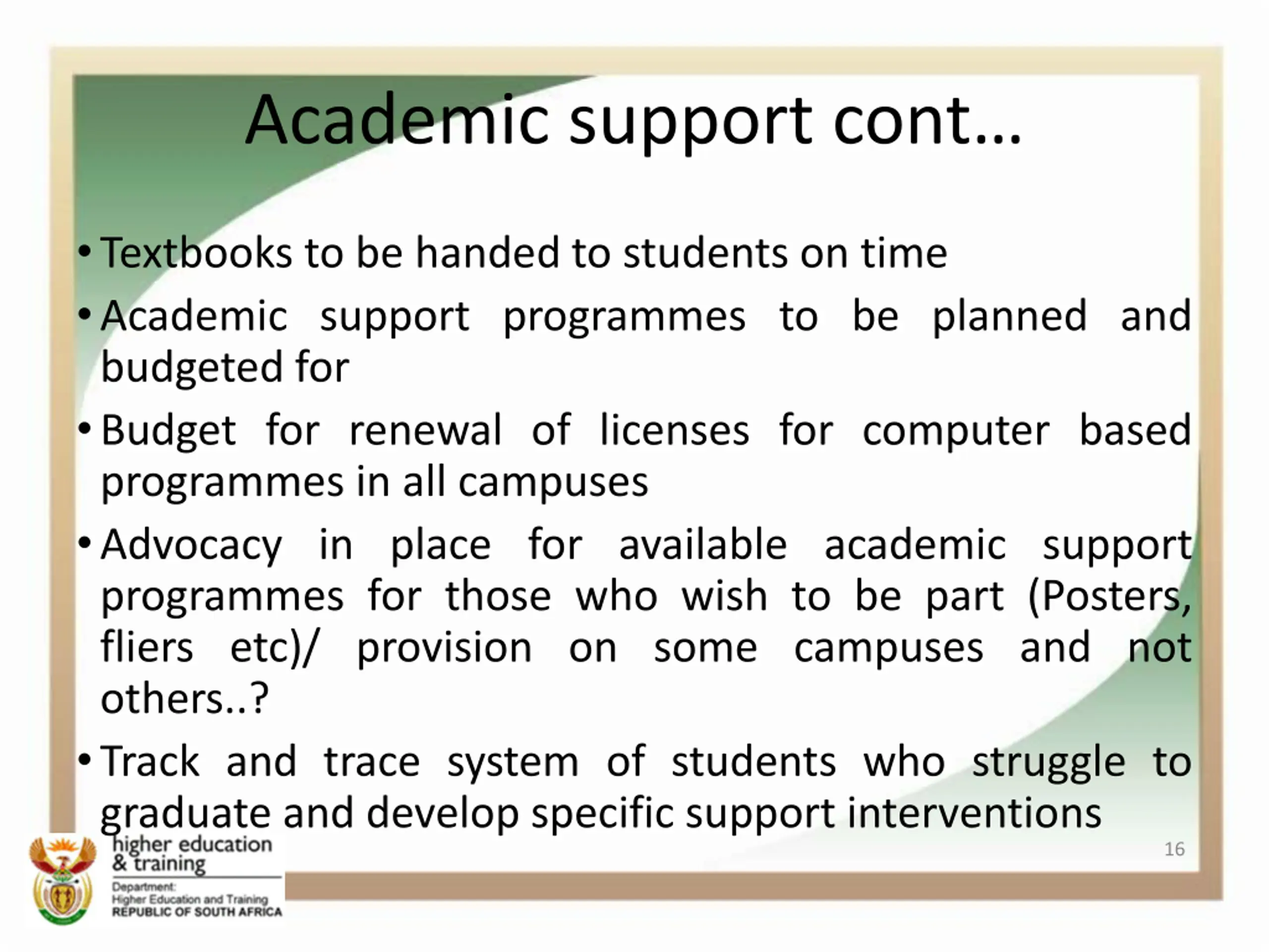 Academic support strategies Additional programmes (subject to available funding)/ partnership with Universities / industry ) Summer or winter schools Catch up programmes After school classes Technology assisted programmes Digital/ online learning applications Course management programmes archive material (lecturer communicate with students online) YouTube type videos or lectures on college intranet Online forums/ discussions for students to assist each other 15