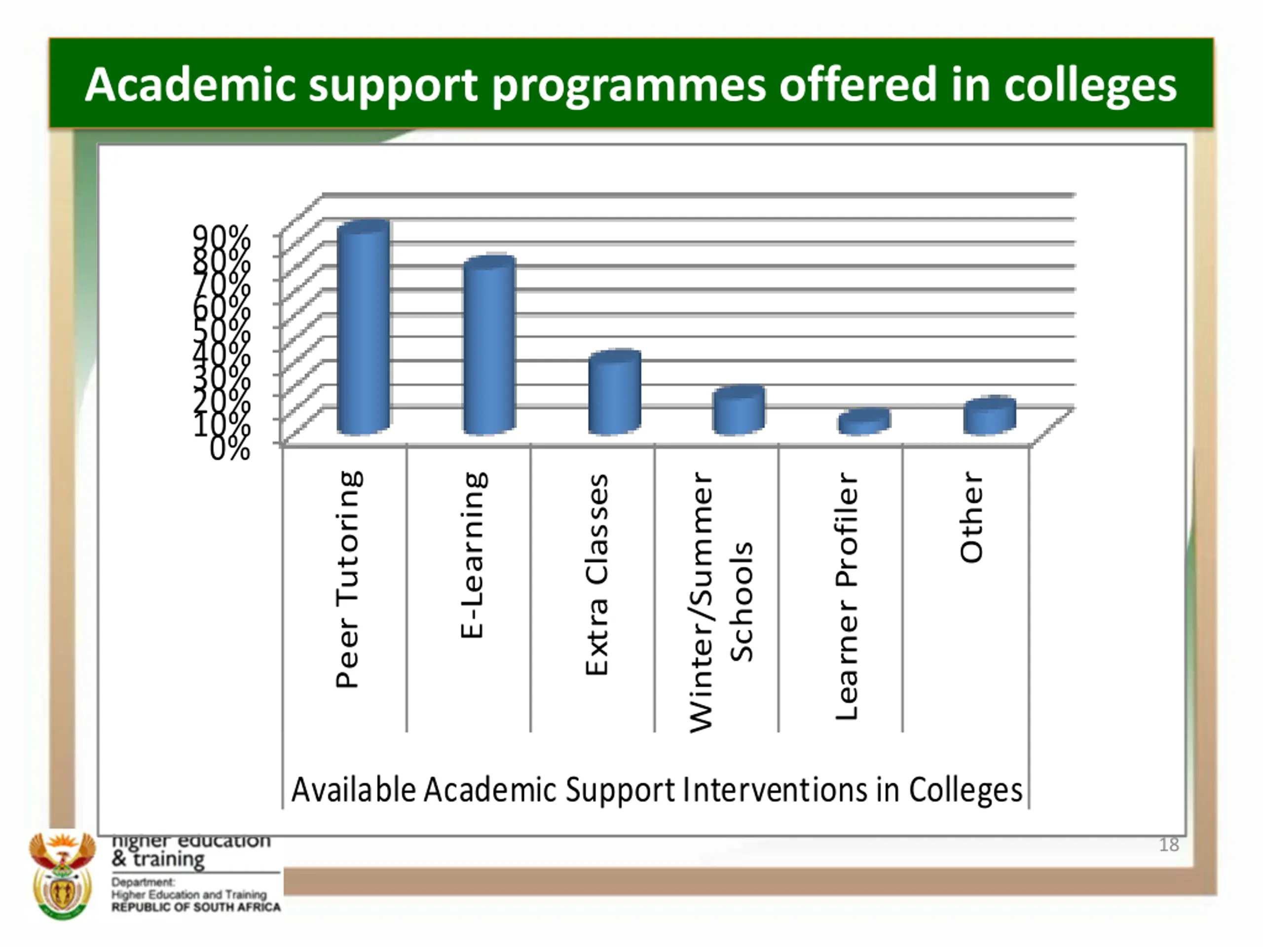 Academic support programmes offered in colleges 90% 80% 70% 60% 50% 40% 30% 20% 10% 0% Peer Tutoring Other E-Learning Winter/Summer Learner Profiler Extra Classes Schools Available Academic Support Interventions in Colleges 18