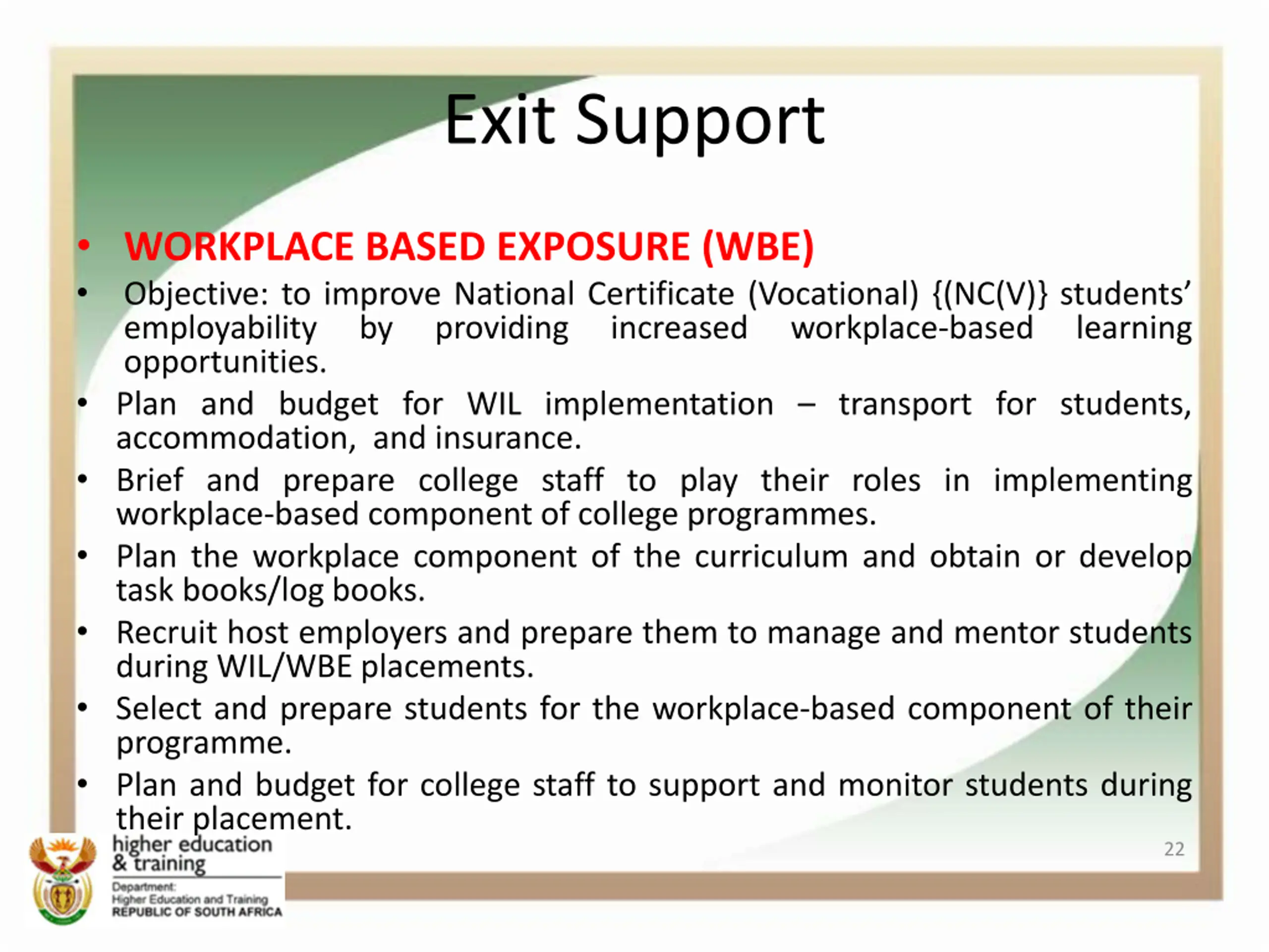 Exit Support WORKPLACE BASED EXPOSURE (WBE) Objective: to improve National Certificate (Vocational) {(NC(V)} students employability by providing increased opportunities. Plan and budget for WIL implementation transport for students, accommodation, and insurance. Brief and prepare college staff to play their roles in implementing workplace-based component of college programmes. Plan the workplace component of the curriculum and obtain or develop task books/log books. Recruit host employers and prepare them to manage and mentor students during WIL/WBE placements. Select and prepare students for the workplace-based component of their programme. Plan and budget for college staff to support and monitor students during their placement. workplace-based learning 22