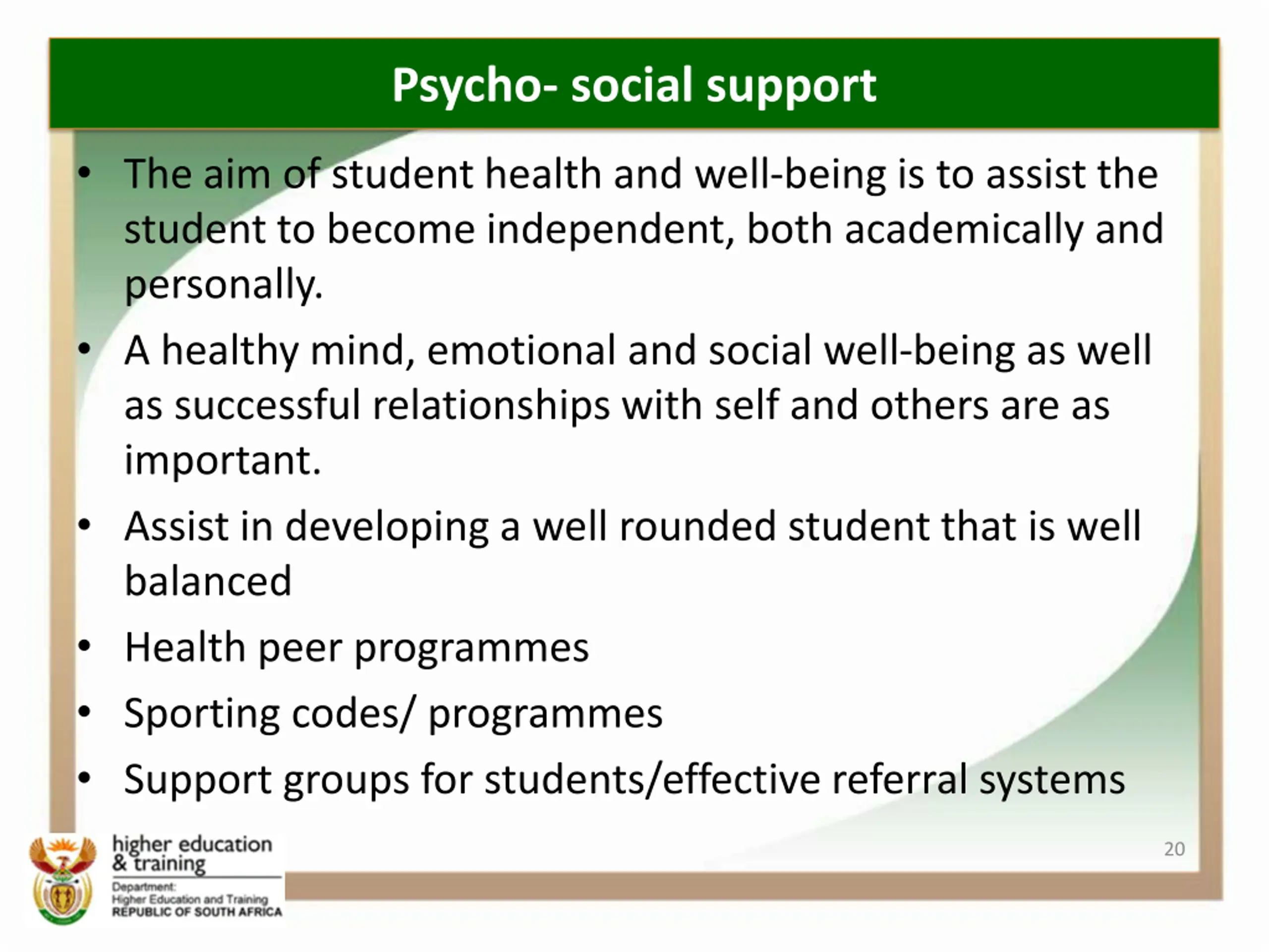 Psycho- social support The aim of student health and well-being is to assist the student to become independent, both academically and personally. A healthy mind, emotional and social well-being as well as successful relationships with self and others are as important. Assist in developing a well rounded student that is well balanced Health peer programmes Sporting codes/ programmes Support groups for students/effective referral systems 20