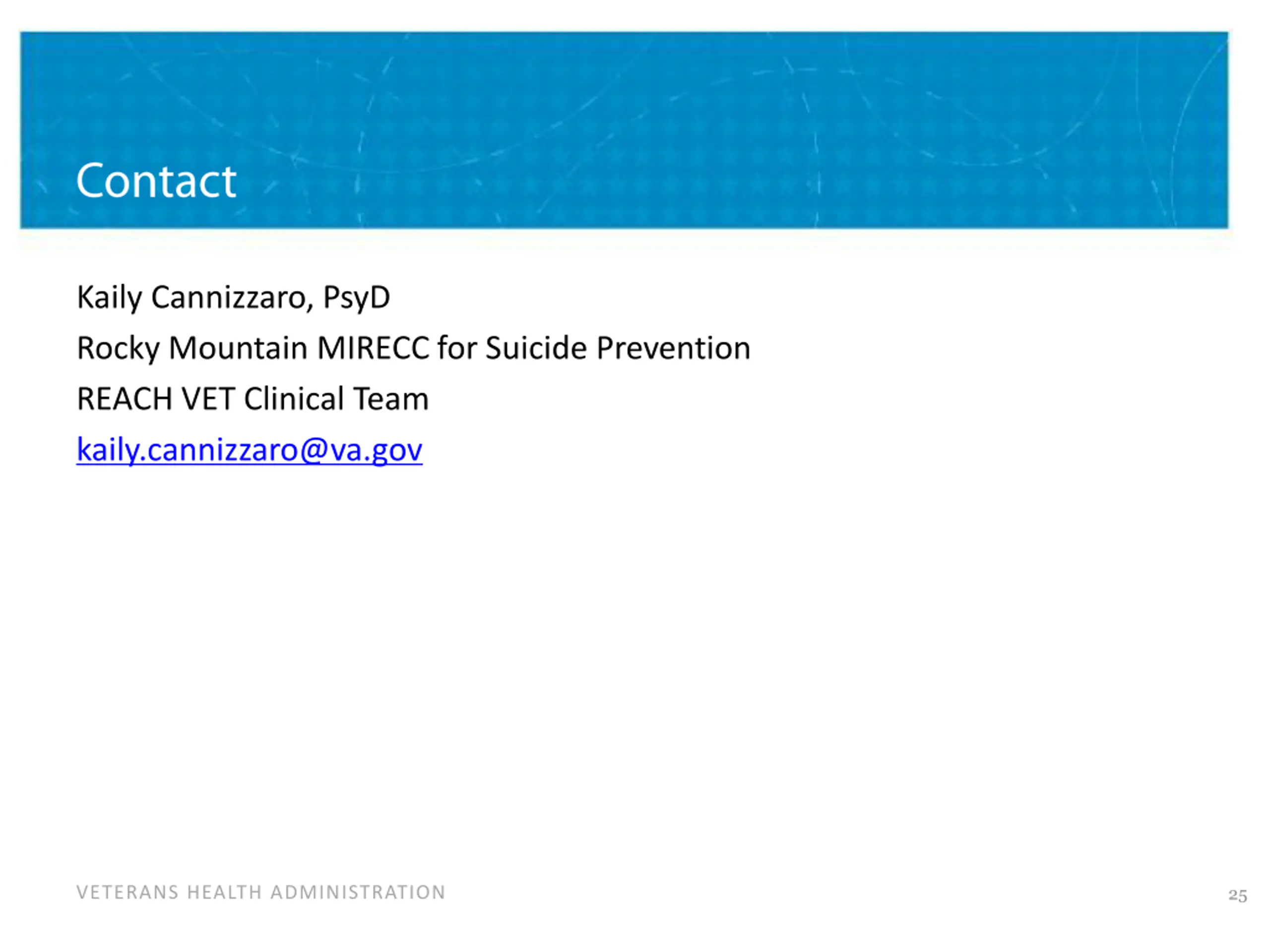 Kaily Cannizzaro, PsyD Rocky Mountain MIRECC for Suicide Prevention REACH VET Clinical Team kaily.cannizzaro@va.gov VETERANS HEALTH ADMINISTRATION 25