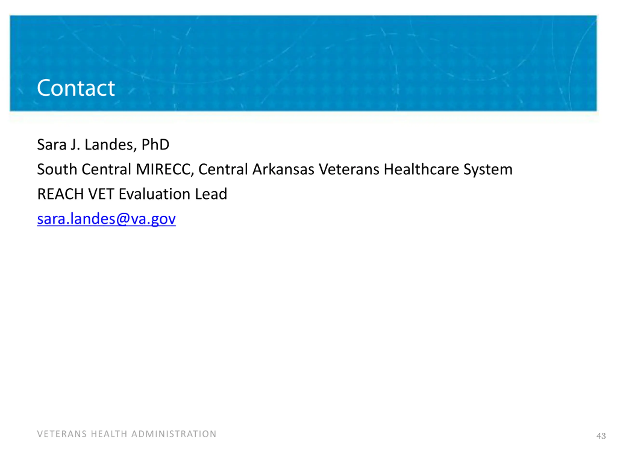Sara J. Landes, PhD South Central MIRECC, Central Arkansas Veterans Healthcare System REACH VET Evaluation Lead sara.landes@va.gov VETERANS HEALTH ADMINISTRATION 43