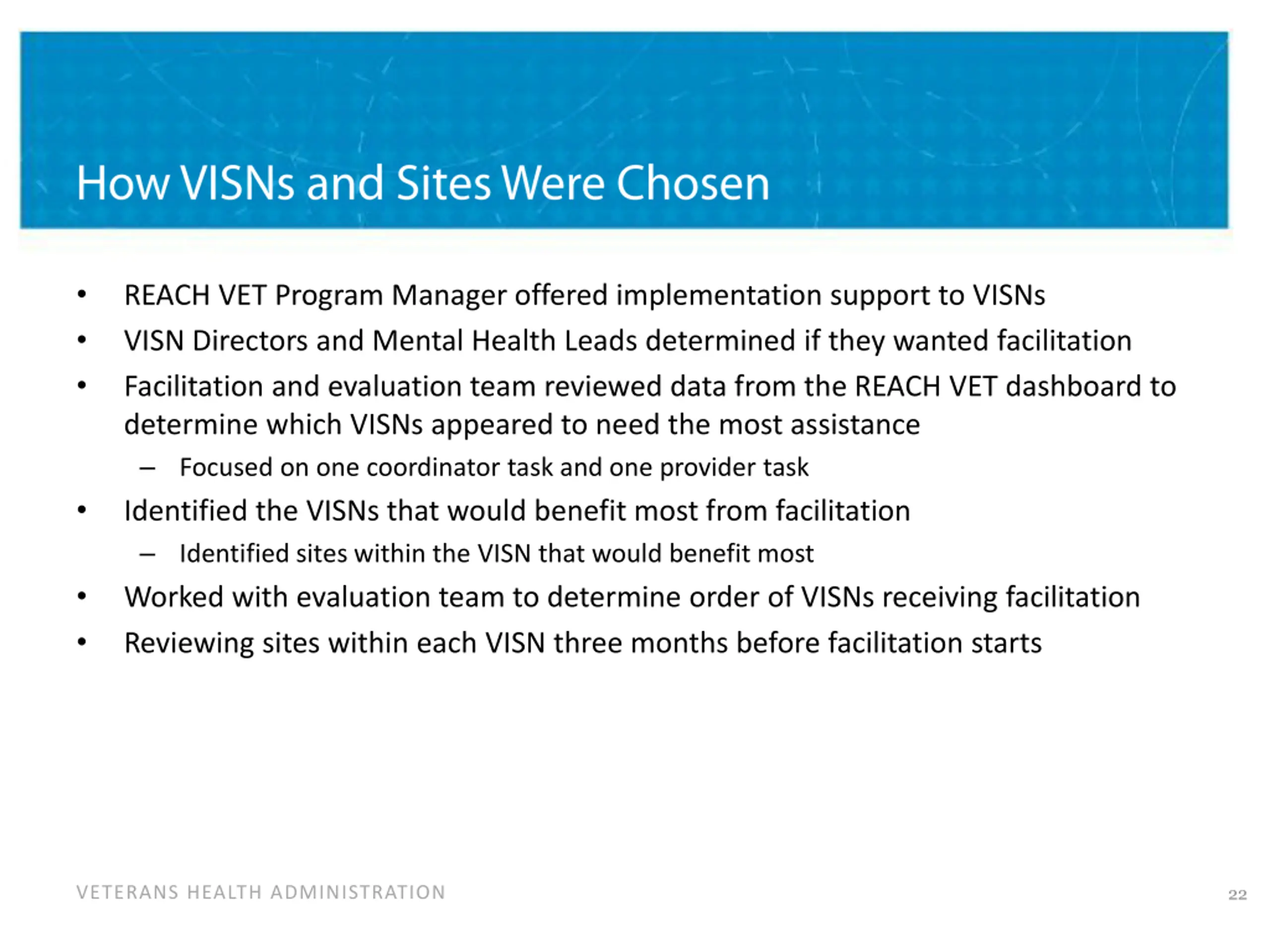 REACH VET Program Manager offered implementation support to VISNs VISN Directors and Mental Health Leads determined if they wanted facilitation Facilitation and evaluation team reviewed data from the REACH VET dashboard to determine which VISNs appeared to need the most assistance Focused on one coordinator task and one provider task Identified the VISNs that would benefit most from facilitation Identified sites within the VISN that would benefit most Worked with evaluation team to determine order of VISNs receiving facilitation Reviewing sites within each VISN three months before facilitation starts VETERANS HEALTH ADMINISTRATION 22