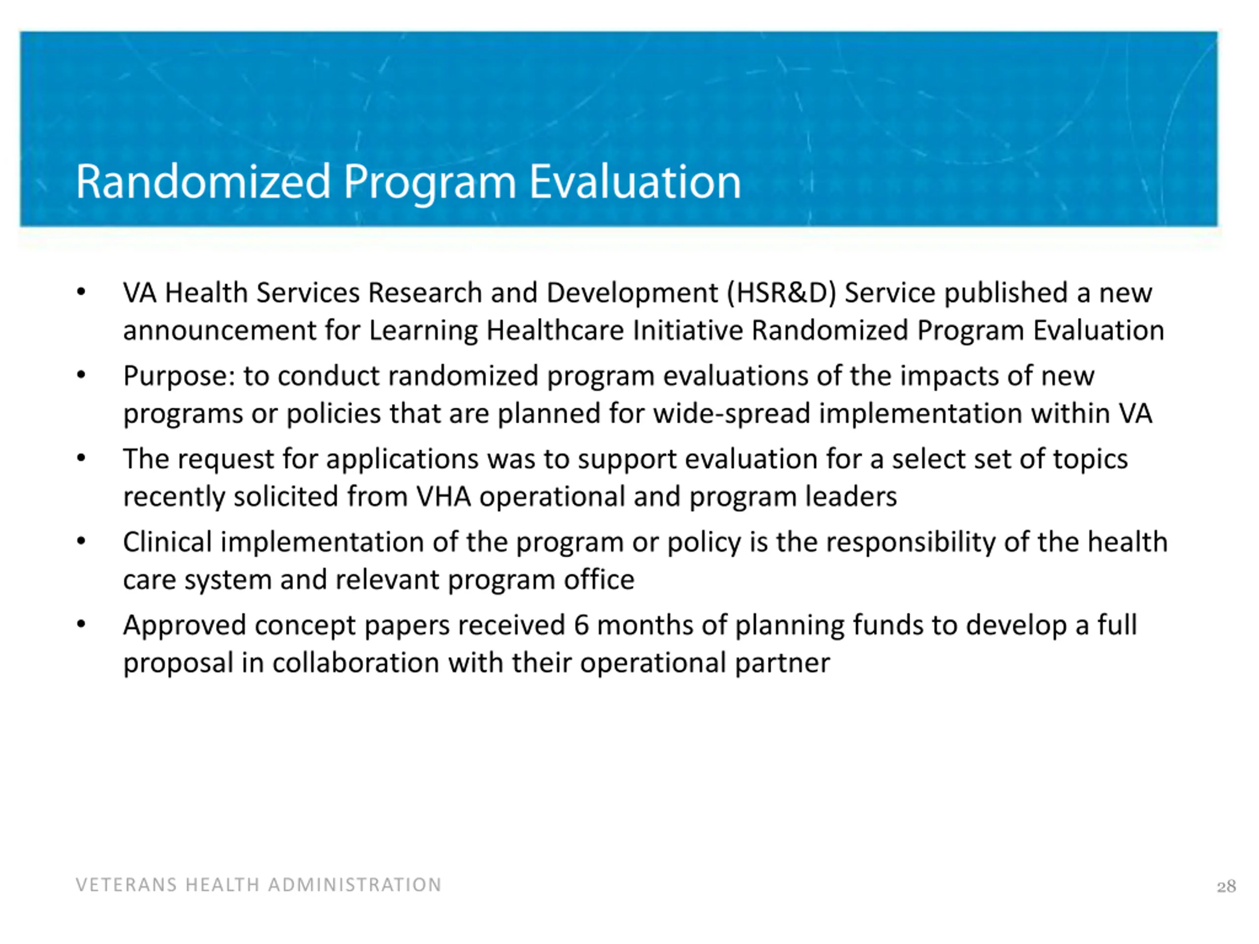 VA Health Services Research and Development (HSR&D) Service published a new announcement for Learning Healthcare Initiative Randomized Program Evaluation Purpose: to conduct randomized program evaluations of the impacts of new programs or policies that are planned for wide-spread implementation within VA The request for applications was to support evaluation for a select set of topics recently solicited from VHA operational and program leaders Clinical implementation of the program or policy is the responsibility of the health care system and relevant program office Approved concept papers received 6 months of planning funds to develop a full proposal in collaboration with their operational partner VETERANS HEALTH ADMINISTRATION 28