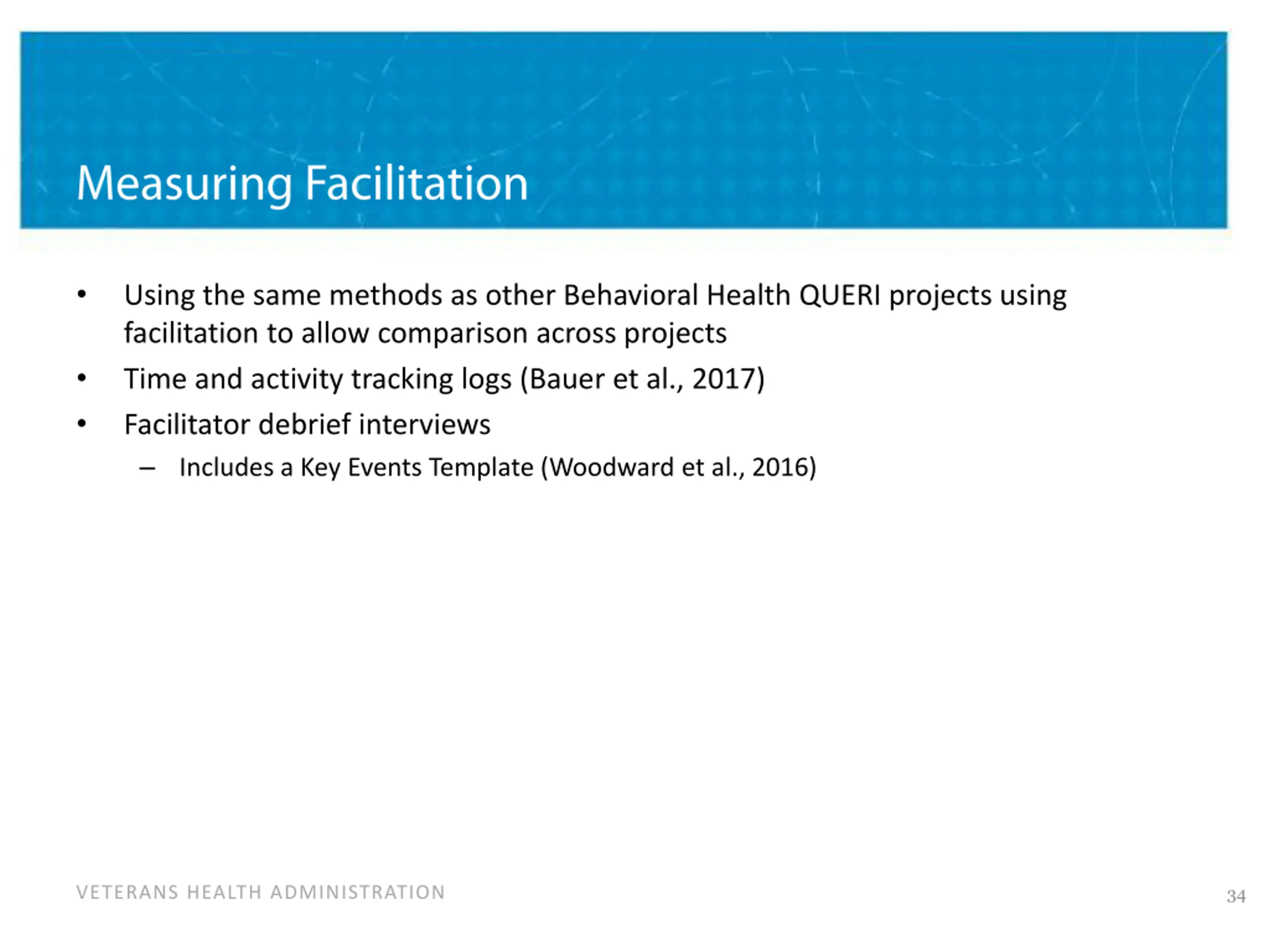 Using the same methods as other Behavioral Health QUERI projects using facilitation to allow comparison across projects Time and activity tracking logs (Bauer et al., 2017) Facilitator debrief interviews Includes a Key Events Template (Woodward et al., 2016) VETERANS HEALTH ADMINISTRATION 34