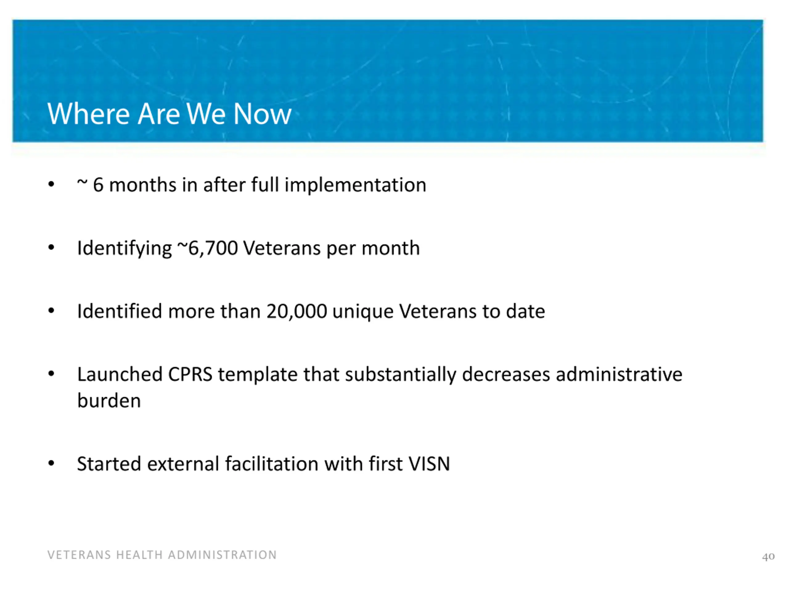 ~ 6 months in after full implementation Identifying ~6,700 Veterans per month Identified more than 20,000 unique Veterans to date Launched CPRS template that substantially decreases administrative burden Started external facilitation with first VISN VETERANS HEALTH ADMINISTRATION 40