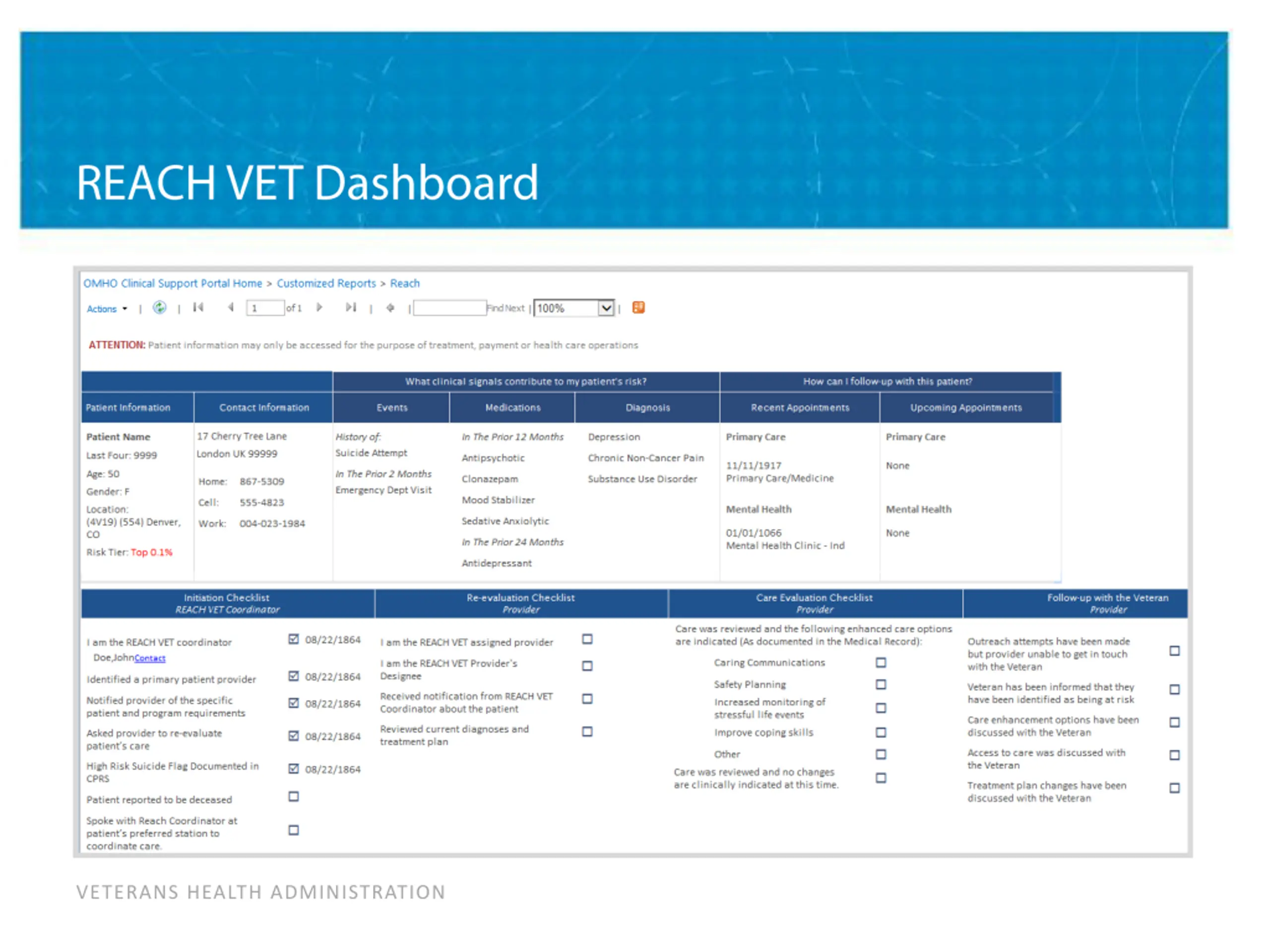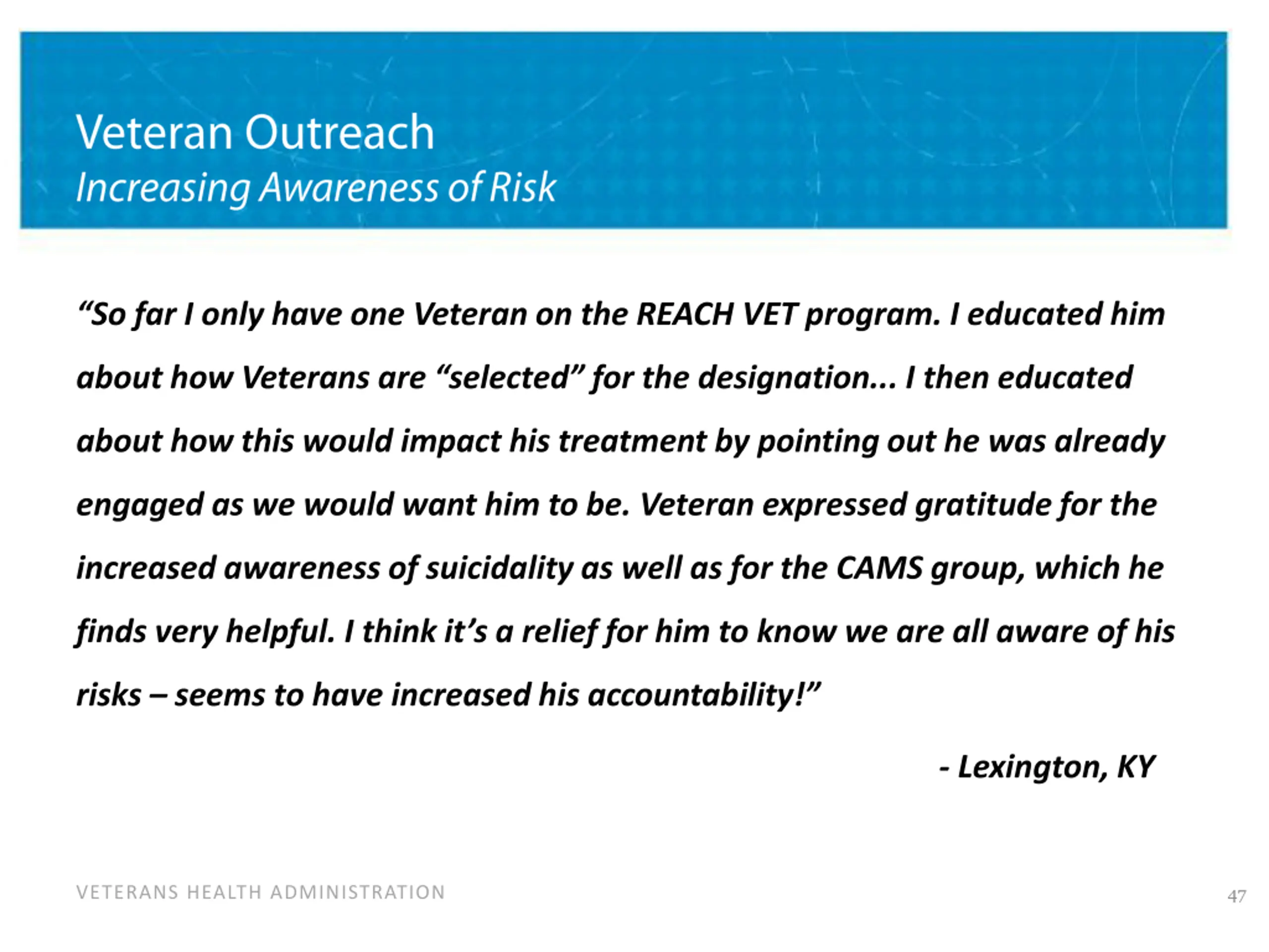 So far I only have one Veteran on the REACH VET program. I educated him about how Veterans are selected for the designation... I then educated about how this would impact his treatment by pointing out he was already engaged as we would want him to be. Veteran expressed gratitude for the increased awareness of suicidality as well as for the CAMS group, which he finds very helpful. I think it s a relief for him to know we are all aware of his risks seems to have increased his accountability! - Lexington, KY VETERANS HEALTH ADMINISTRATION 47