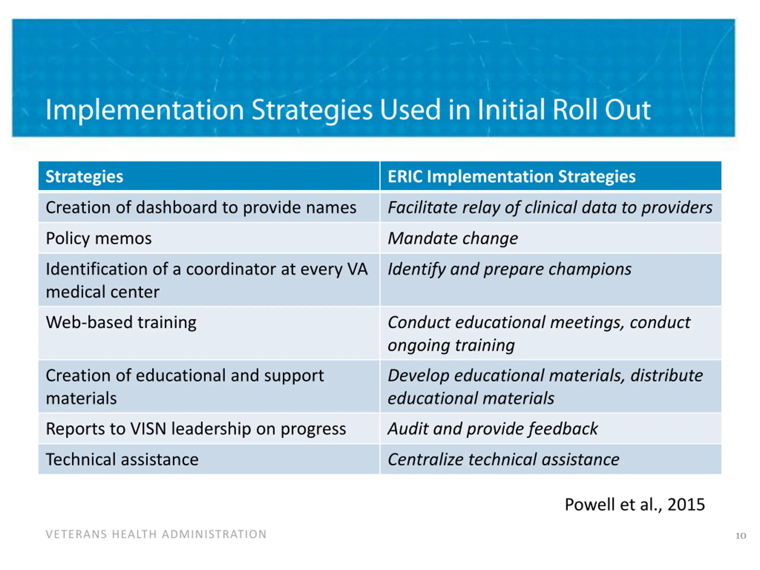 Strategies ERIC Implementation Strategies Creation of dashboard to provide names Facilitate relay of clinical data to providers Policy memos Mandate change Identification of a coordinator at every VA medical center Identify and prepare champions Web-based training Conduct educational meetings, conduct ongoing training Creation of educational and support materials Develop educational materials, distribute educational materials Reports to VISN leadership on progress Audit and provide feedback Technical assistance Centralize technical assistance Powell et al., 2015 VETERANS HEALTH ADMINISTRATION 10