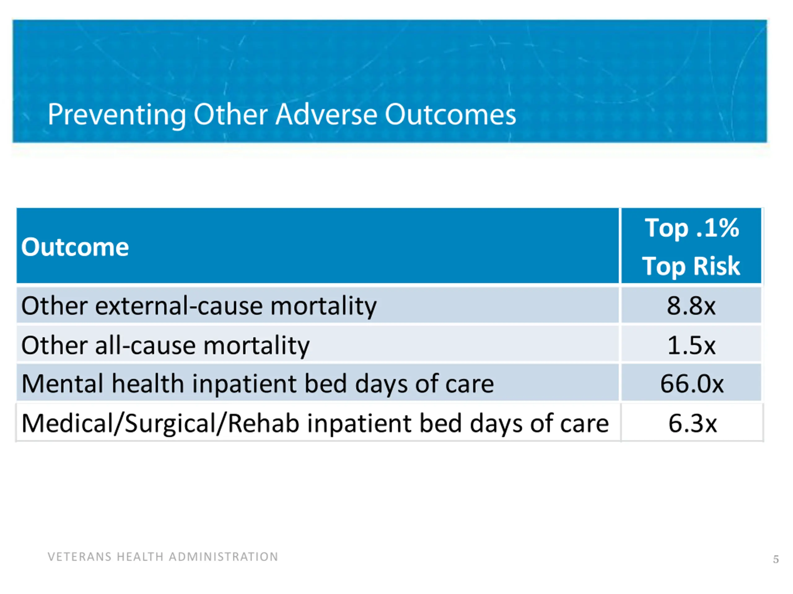 Developed by VA and NIMH researchers Includes clinical and administrative data for each Veteran who utilizes VHA health care services Calculated Risk Outcome Top .1% Top Risk Suicide (one month) 33 x Suicide (one year) 15 x Suicide attempt (one year) 81 x *As compared to overall VHA population VETERANS HEALTH ADMINISTRATION 4