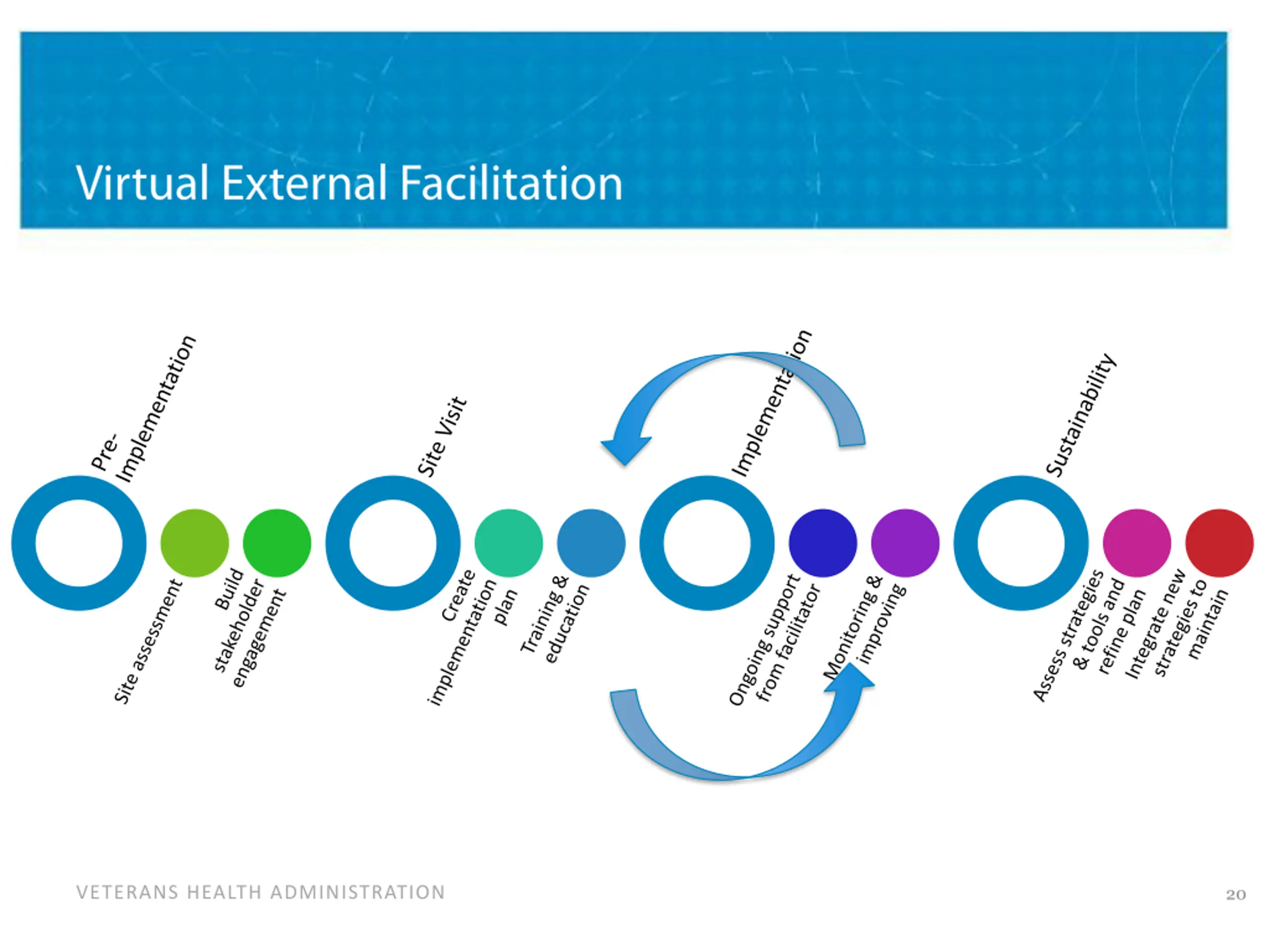 External Facilitator Facilitators Kaily Cannizzaro Georgia Gerard Molly Jankovsky Clinical experts in suicide prevention Trained in facilitation 2 day training with VA experts in facilitation Included a virtual component Site champions REACH VET Coordinator Site Champion VETERANS HEALTH ADMINISTRATION 19