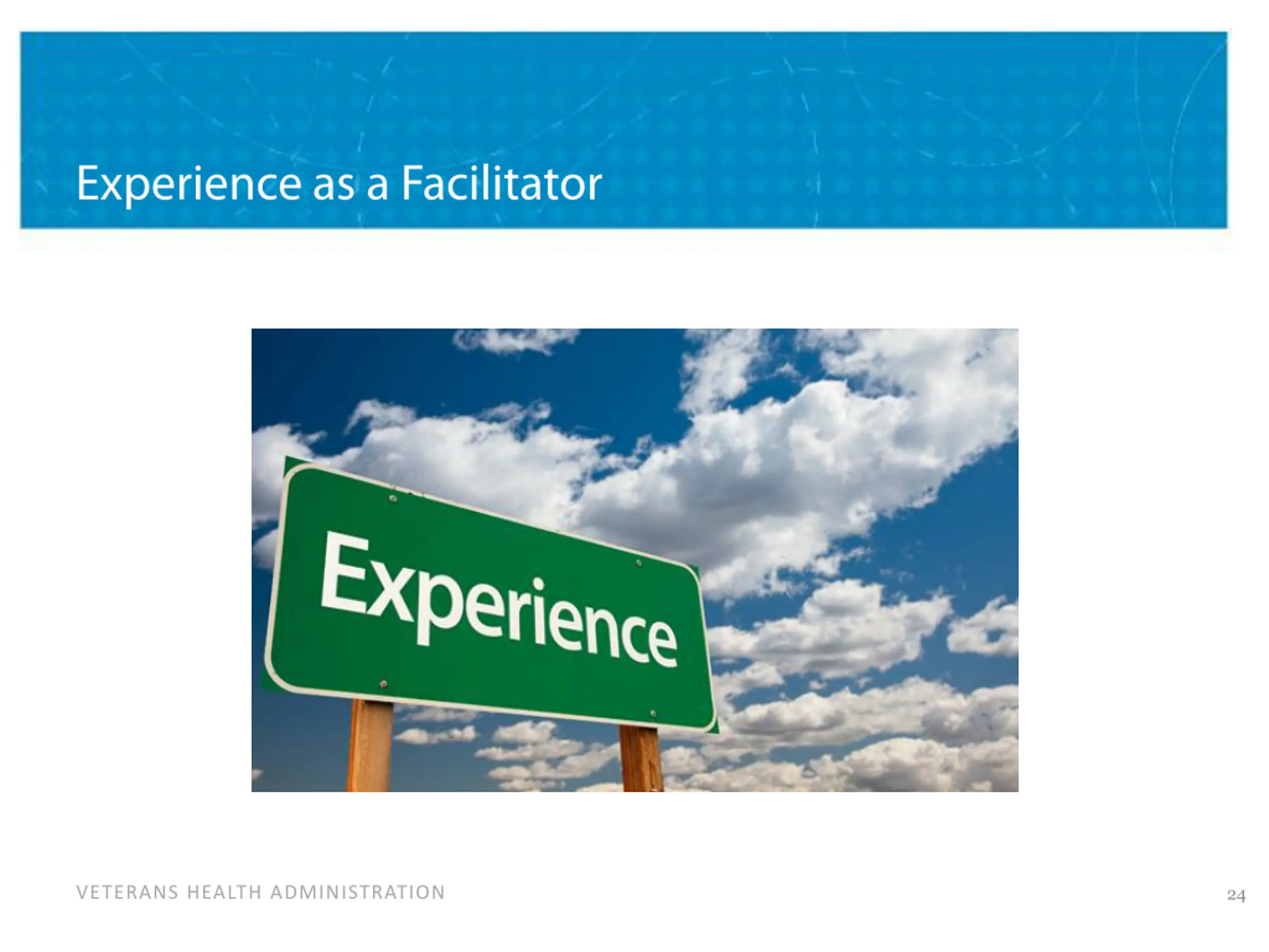 The facilitators are also part of the clinical team for REACH VET Have helped created and lead Online trainings for coordinators and providers Videos to demonstrate actions needed in REACH VET Provide technical assistance via REACH VET helpdesk email Created a facilitation toolbox customized to REACH VET VETERANS HEALTH ADMINISTRATION 23